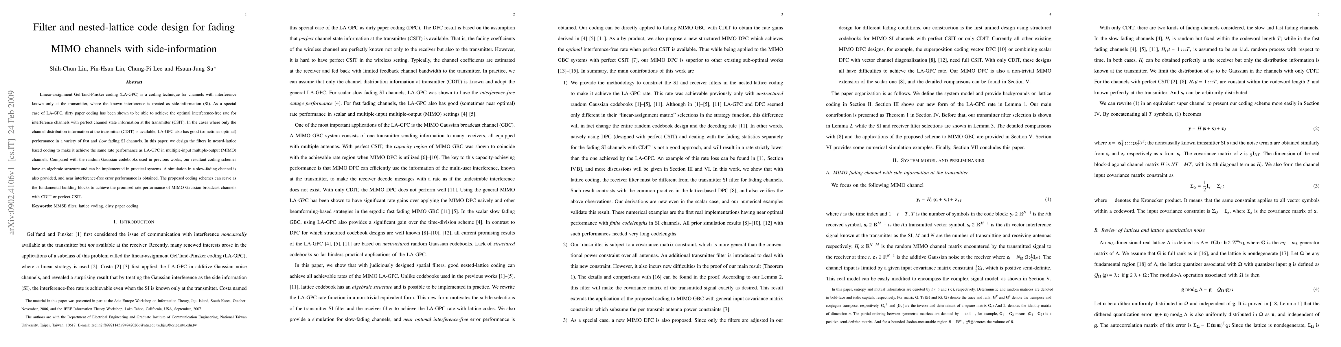 Linear-assignment Gel'fand-Pinsker coding (LA-GPC) is a coding technique for channels with interference known only at the transmitter, where the known interference is treated as side-information (SI). As a special case of LA-GPC, dirty paper coding has been shown to be able to achieve the optimal interference-free rate for interference channels with perfect channel state information at the transmitter (CSIT). In the cases where only the channel distribution information at the transmitter (CDIT) is available, LA-GPC also has good (sometimes optimal) performance in a variety of fast and slow fading SI channels. In this paper, we design the filters in nested-lattice based coding to make it achieve the same rate performance as LA-GPC in multiple-input multiple-output (MIMO) channels. Compared with the random Gaussian codebooks used in previous works, our resultant coding schemes have an algebraic structure and can be implemented in practical systems. A simulation in a slow-fading channel is also provided, and near interference-free error performance is obtained. The proposed coding schemes can serve as the fundamental building blocks to achieve the promised rate performance of MIMO Gaussian broadcast channels with CDIT or perfect CSIT