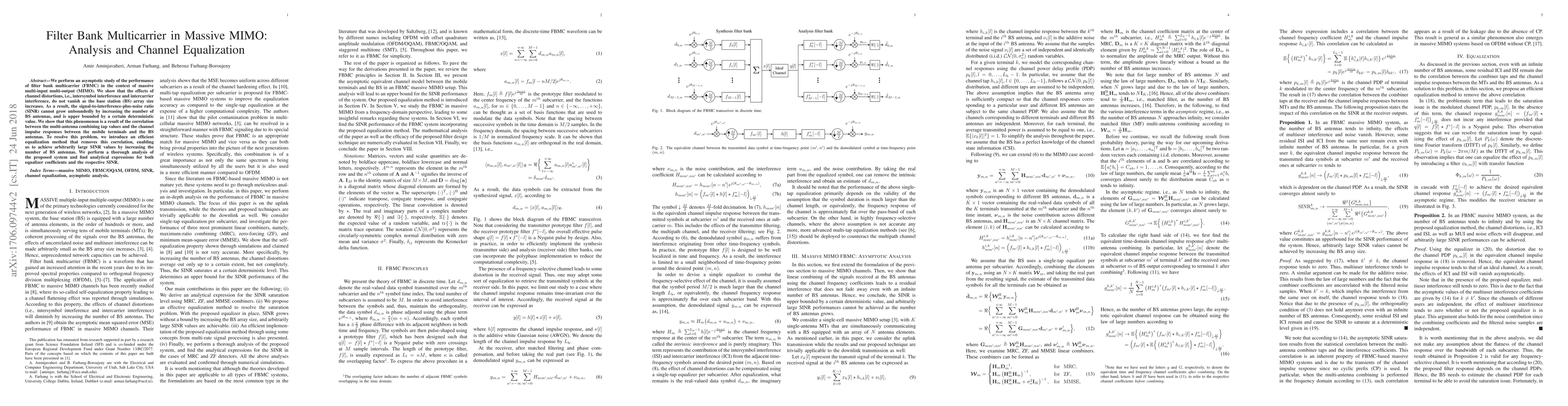 This paper analyzes the performance of filter bank multicarrier (FBMC) in massive MIMO systems, revealing that channel distortions limit the unbounded growth of signal-to-interference-plus-noise ratio (SINR) despite increasing base station antennas. It proposes an efficient equalization method to remove the correlation between combining tap values and channel responses, enabling large SINR values with more antennas.
