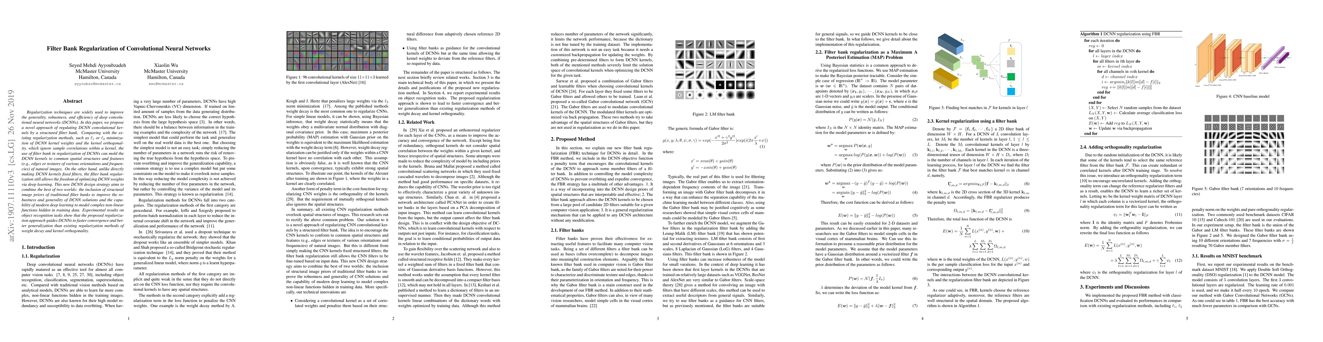 This paper proposes a novel filter bank regularization method for convolutional neural networks to improve their robustness and generalization. Unlike existing methods, this approach molds DCNN kernels to common spatial structures while still allowing deep learning optimization, leading to faster convergence and better performance in object recognition tasks.