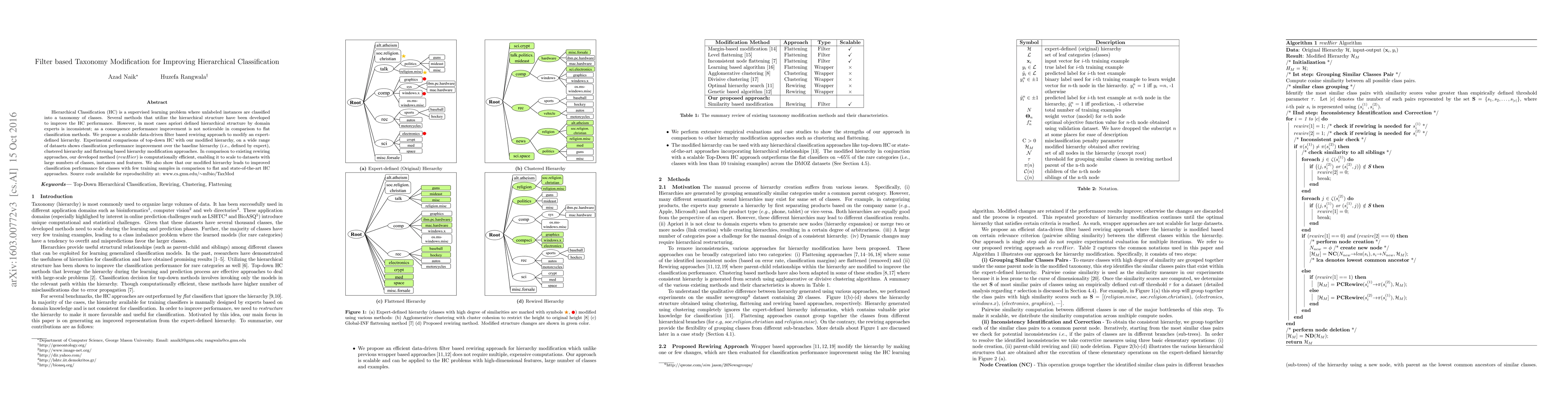 Hierarchical Classification (HC) is a supervised learning problem where unlabeled instances are classified into a taxonomy of classes. Several methods that utilize the hierarchical structure have been developed to improve the HC performance. However, in most cases apriori defined hierarchical structure by domain experts is inconsistent; as a consequence performance improvement is not noticeable in comparison to flat classification methods. We propose a scalable data-driven filter based rewiring approach to modify an expert-defined hierarchy. Experimental comparisons of top-down HC with our modified hierarchy, on a wide range of datasets shows classification performance improvement over the baseline hierarchy (i:e:, defined by expert), clustered hierarchy and flattening based hierarchy modification approaches. In comparison to existing rewiring approaches, our developed method (rewHier) is computationally efficient, enabling it to scale to datasets with large numbers of classes, instances and features. We also show that our modified hierarchy leads to improved classification performance for classes with few training samples in comparison to flat and state-of-the-art HC approaches.