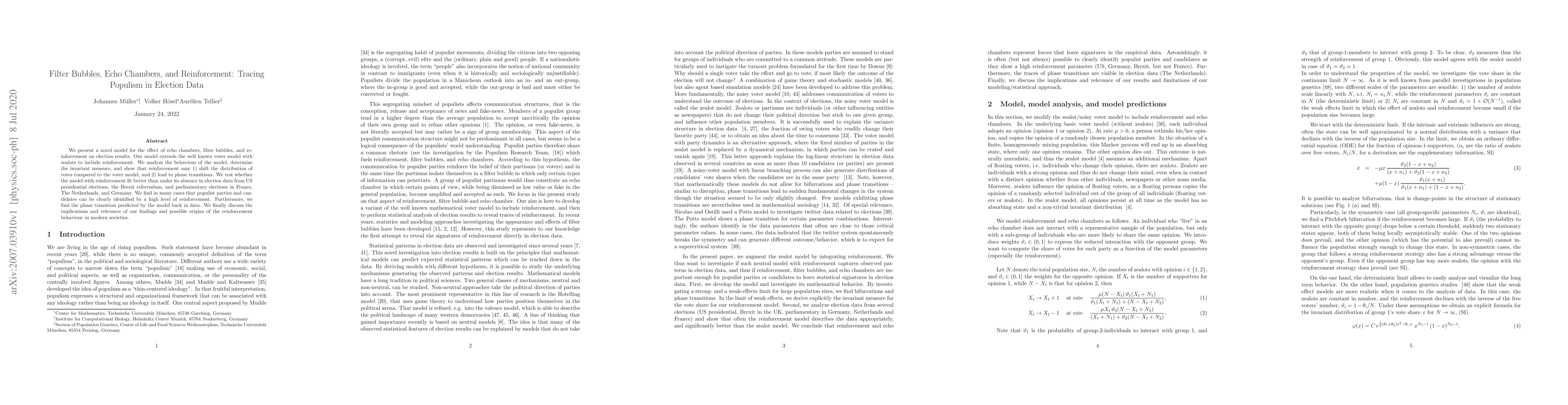 We present a novel model for the effect of echo chambers, filter bubbles, and reinforcement on election results. Our model extends the well known voter model with zealots to include reinforcement. We analyze the behaviour of the model, determine the invariant measure, and show that reinforcement may 1) shift the distribution of votes compared to the voter model, and 2) lead to phase transitions. We test whether the model with reinforcement fit better than under its absence in election data from US presidential elections, the Brexit referendum, and parliamentary elections in France, The Netherlands, and Germany. We find in many cases that populist parties and candidates can be clearly identified by a high level of reinforcement. Furthermore, we find the phase transition predicted by the model back in data. We finally discuss the implications and relevance of our findings and possible origins of the reinforcement behaviour in modern societies.
