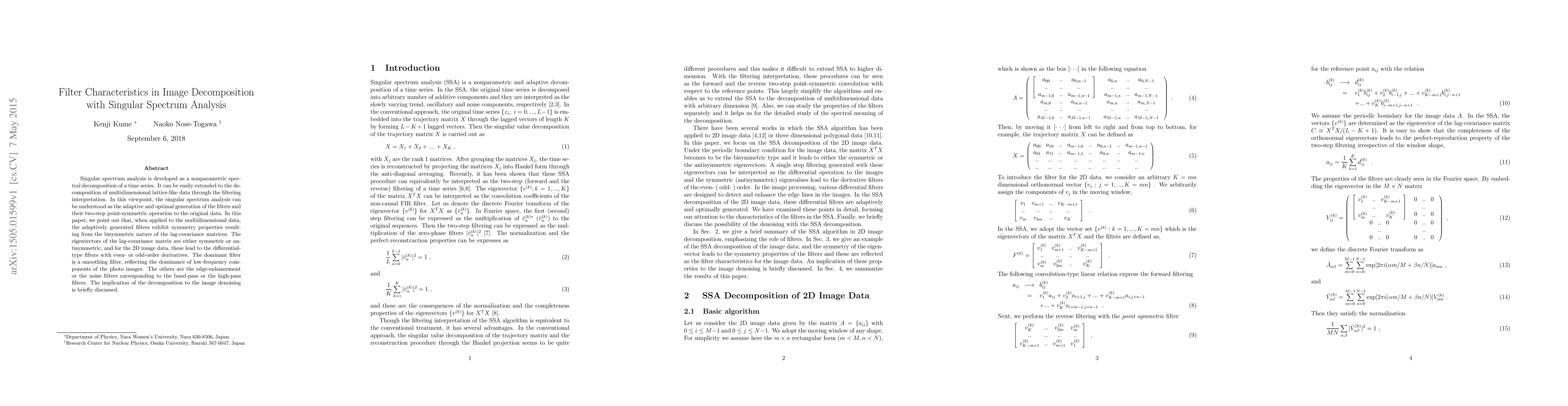 This paper explores the application of singular spectrum analysis for decomposing multidimensional data, specifically 2D images, through adaptively generated filters. The filters exhibit symmetry properties due to the bisymmetric nature of the lag-covariance matrices, leading to smoothing, edge-enhancement, and noise filters, with implications for image denoising.