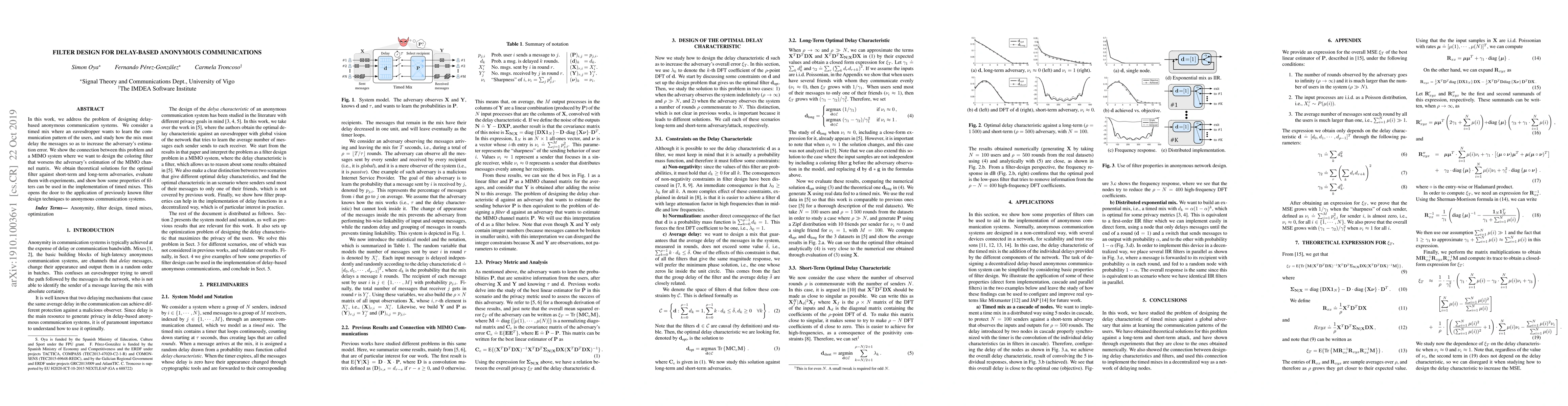 The paper addresses the problem of designing delay-based anonymous communication systems. It models a timed mix where an adversary aims to learn the communication pattern of users. The authors connect this problem to a MIMO system, focusing on designing a coloring filter that degrades the adversary's estimation of the MIMO channel matrix. They derive theoretical solutions for optimal filters against short-term and long-term adversaries, validate them through experiments, and discuss how filter properties can be utilized in timed mix implementations.