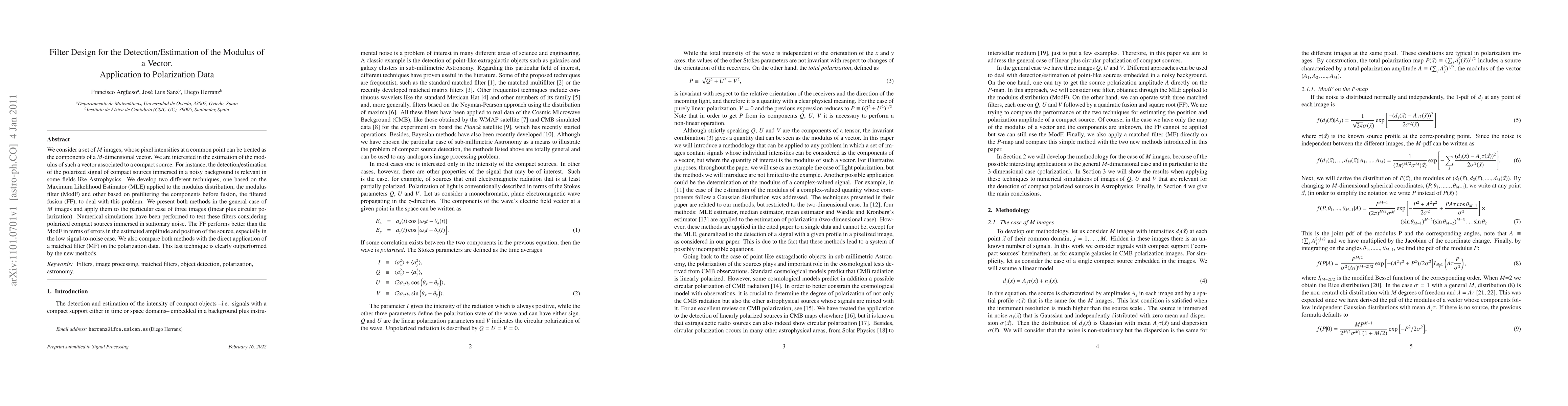 We consider a set of M images, whose pixel intensities at a common point can be treated as the components of a M-dimensional vector. We are interested in the estimation of the modulus of such a vector associated to a compact source. For instance, the detection/estimation of the polarized signal of compact sources immersed in a noisy background is relevant in some fields like Astrophysics. We develop two different techniques, one based on the Maximum Likelihood Estimator (MLE) applied to the modulus distribution, the modulus filter (ModF) and other based on prefiltering the components before fusion, the filtered fusion (FF), to deal with this problem. We present both methods in the general case of M images and apply them to the particular case of three images (linear plus circular polarization). Numerical simulations have been performed to test these filters considering polarized compact sources immersed in stationary noise. The FF performs better than the ModF in terms of errors in the estimated amplitude and position of the source, especially in the low signal-to-noise case. We also compare both methods with the direct application of a matched filter (MF) on the polarization data. This last technique is clearly outperformed by the new methods.