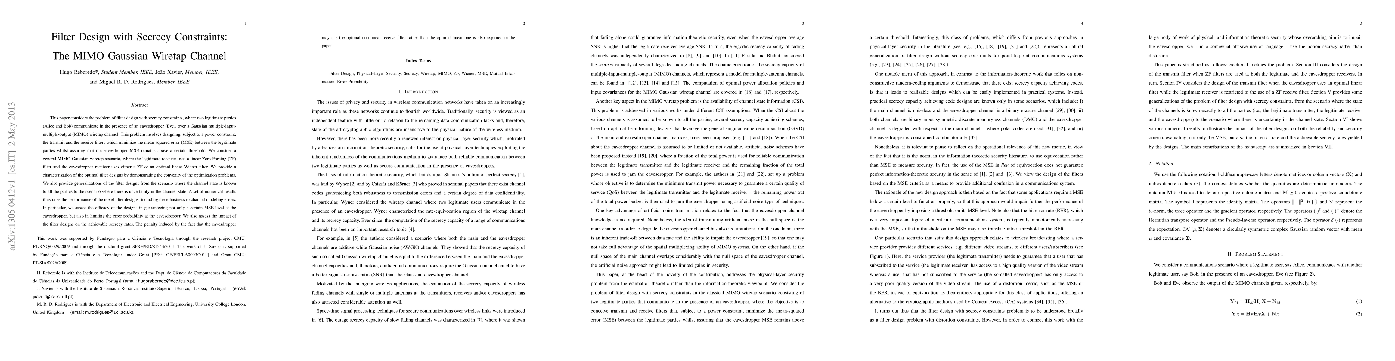 This paper considers the problem of filter design with secrecy constraints, where two legitimate parties (Alice and Bob) communicate in the presence of an eavesdropper (Eve), over a Gaussian multiple-input-multiple-output (MIMO) wiretap channel. This problem involves designing, subject to a power constraint, the transmit and the receive filters which minimize the mean-squared error (MSE) between the legitimate parties whilst assuring that the eavesdropper MSE remains above a certain threshold. We consider a general MIMO Gaussian wiretap scenario, where the legitimate receiver uses a linear Zero-Forcing (ZF) filter and the eavesdropper receiver uses either a ZF or an optimal linear Wiener filter. We provide a characterization of the optimal filter designs by demonstrating the convexity of the optimization problems. We also provide generalizations of the filter designs from the scenario where the channel state is known to all the parties to the scenario where there is uncertainty in the channel state. A set of numerical results illustrates the performance of the novel filter designs, including the robustness to channel modeling errors. In particular, we assess the efficacy of the designs in guaranteeing not only a certain MSE level at the eavesdropper, but also in limiting the error probability at the eavesdropper. We also assess the impact of the filter designs on the achievable secrecy rates. The penalty induced by the fact that the eavesdropper may use the optimal non-linear receive filter rather than the optimal linear one is also explored in the paper.