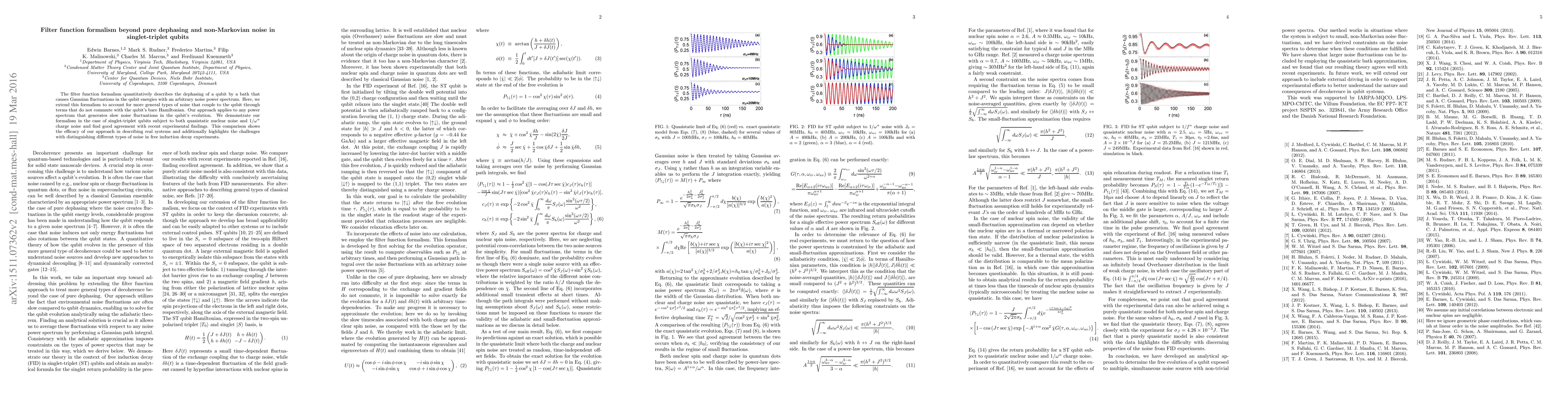 This paper extends the filter function formalism to describe dephasing in singlet-triplet qubits under non-Markovian noise, including quasistatic nuclear and $1/\omega^\alpha$ charge noise, showing good agreement with experimental data and highlighting challenges in noise differentiation.
