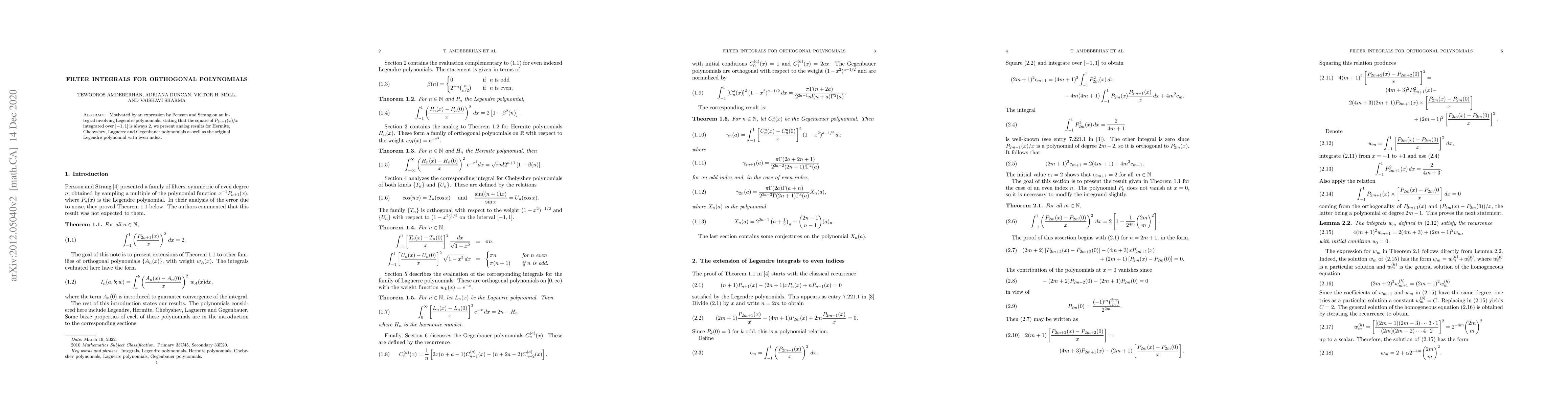 Motivated by an expression by Persson and Strang on an integral involving Legendre polynomials, stating that the square of $P_{2n+1}(x)/x$ integrated over $[-1,1]$ is always $2$, we present analog results for Hermite, Chebyshev, Laguerre and Gegenbauer polynomials as well as the original Legendre polynomial with even index.