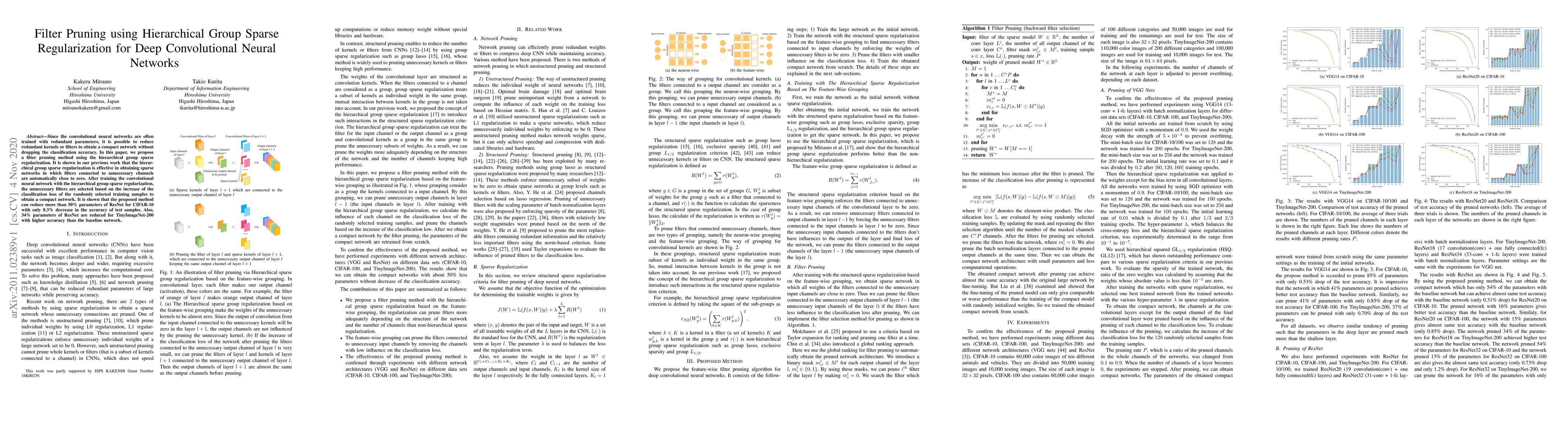 This paper proposes a filter pruning method using hierarchical group sparse regularization for deep convolutional neural networks to remove redundant kernels while maintaining classification accuracy. The method effectively reduces over 50% of ResNet parameters for CIFAR-10 with minimal (0.3%) accuracy loss, and achieves a 34% reduction for TinyImageNet-200 with better performance than the baseline.