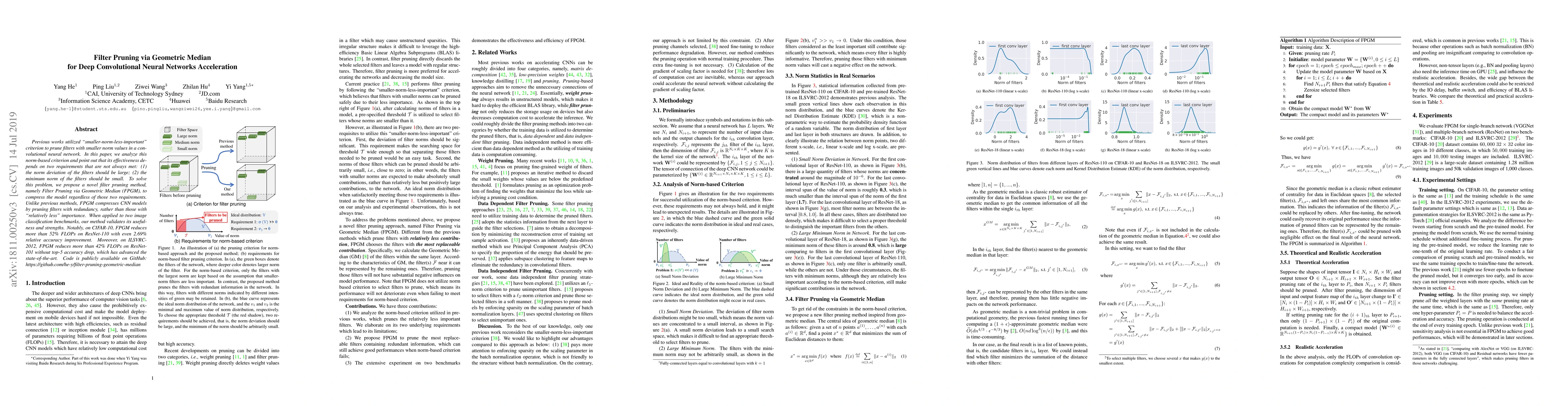 This paper proposes a novel filter pruning method called Filter Pruning via Geometric Median (FPGM) to accelerate deep convolutional neural networks. Unlike previous norm-based methods, FPGM prunes filters based on redundancy rather than relative importance, achieving significant model compression and performance improvements on image classification benchmarks.