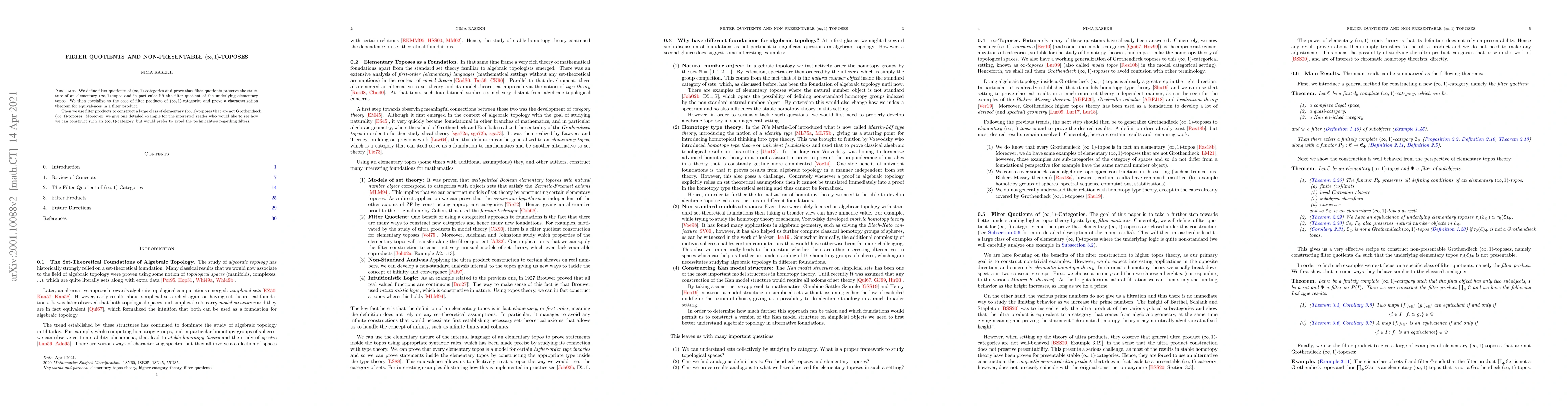 This paper introduces filter quotients of $(\infty,1)$-categories, proving they preserve the structure of elementary $(\infty,1)$-toposes. It further characterizes equivalences in filter products and constructs non-presentable $(\infty,1)$-toposes using these techniques, with an illustrative example provided for clarity.