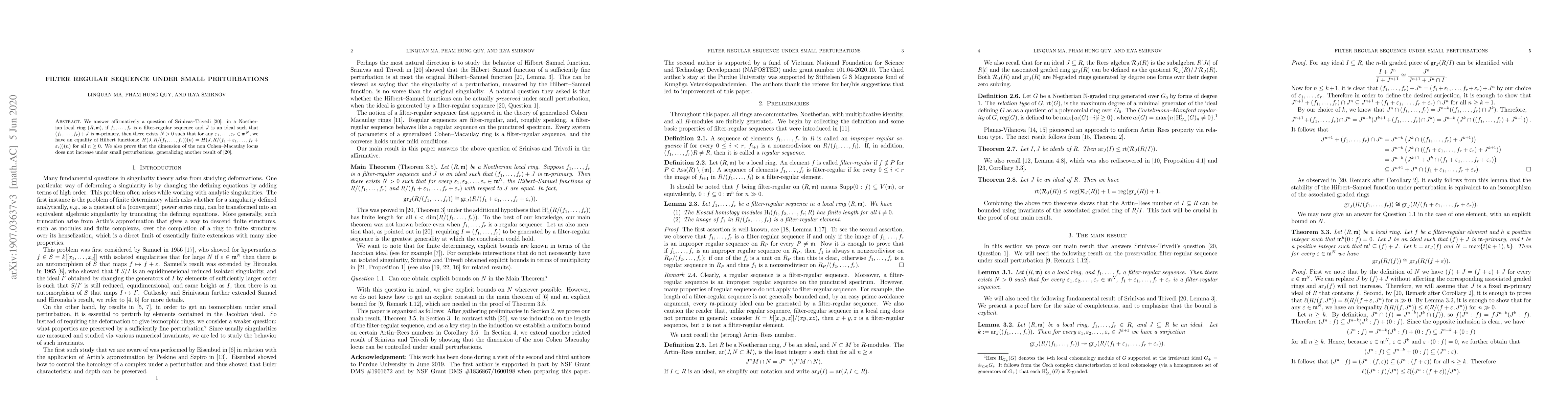 We answer affirmatively a question of Srinivas--Trivedi: in a Noetherian local ring $(R,\mathfrak{m})$, if $I=(f_1,\dots,f_r)$ is an ideal generated by a filter-regular sequence and $J$ is an ideal such that $I+J$ is $\mathfrak{m}$-primary, then there exists $N>0$ such that for any $\varepsilon_1,\dots,\varepsilon_r \in \mathfrak{m}^N$, we have an equality of Hilbert functions: $H(J, R/(f_1,\dots,f_r))(n)=H(J, R/(f_1+\varepsilon_1,\dots, f_r+\varepsilon_r))(n)$ for all $n\geq 0$. We also prove that the dimension of the non Cohen--Macaulay locus does not increase under small perturbations.