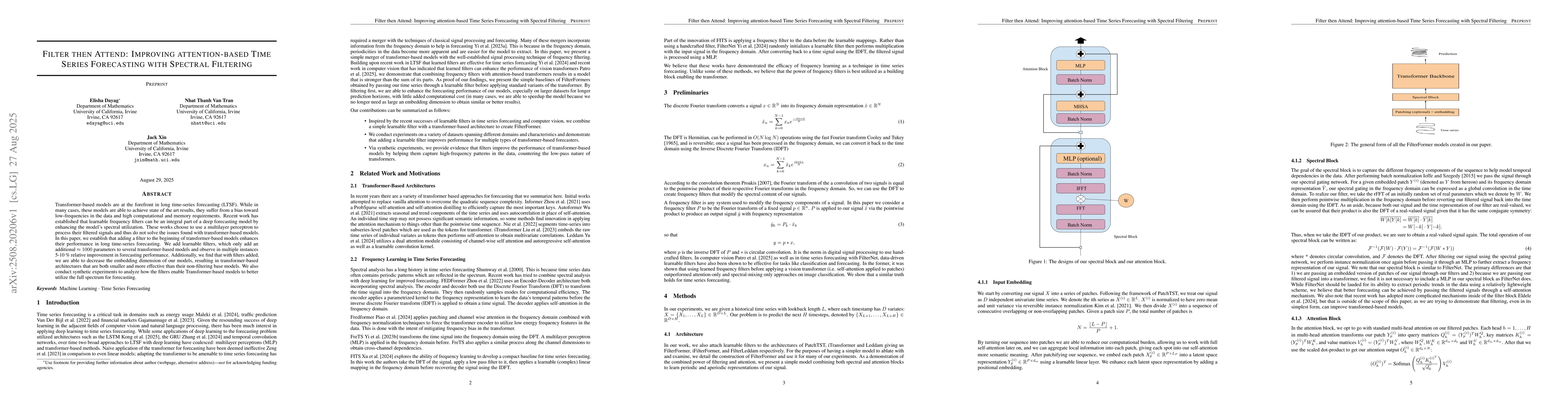 Transformer-based models are at the forefront in long time-series forecasting (LTSF). While in many cases, these models are able to achieve state of the art results, they suffer from a bias toward low-frequencies in the data and high computational and memory requirements. Recent work has established that learnable frequency filters can be an integral part of a deep forecasting model by enhancing the model's spectral utilization. These works choose to use a multilayer perceptron to process their filtered signals and thus do not solve the issues found with transformer-based models. In this paper, we establish that adding a filter to the beginning of transformer-based models enhances their performance in long time-series forecasting. We add learnable filters, which only add an additional $\approx 1000$ parameters to several transformer-based models and observe in multiple instances 5-10 \% relative improvement in forecasting performance. Additionally, we find that with filters added, we are able to decrease the embedding dimension of our models, resulting in transformer-based architectures that are both smaller and more effective than their non-filtering base models. We also conduct synthetic experiments to analyze how the filters enable Transformer-based models to better utilize the full spectrum for forecasting.