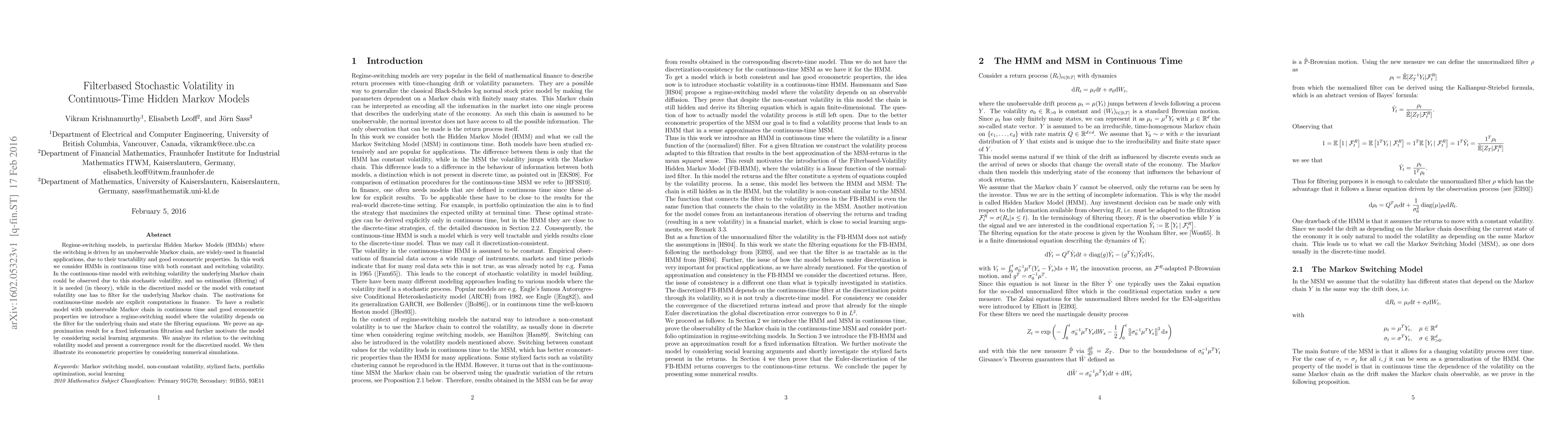 This paper develops a continuous-time Hidden Markov Model with stochastic volatility, addressing the need for filtering in discretized models. It introduces filtering equations for the unobservable Markov chain and proves an approximation result, demonstrating the model's econometric properties through numerical simulations.