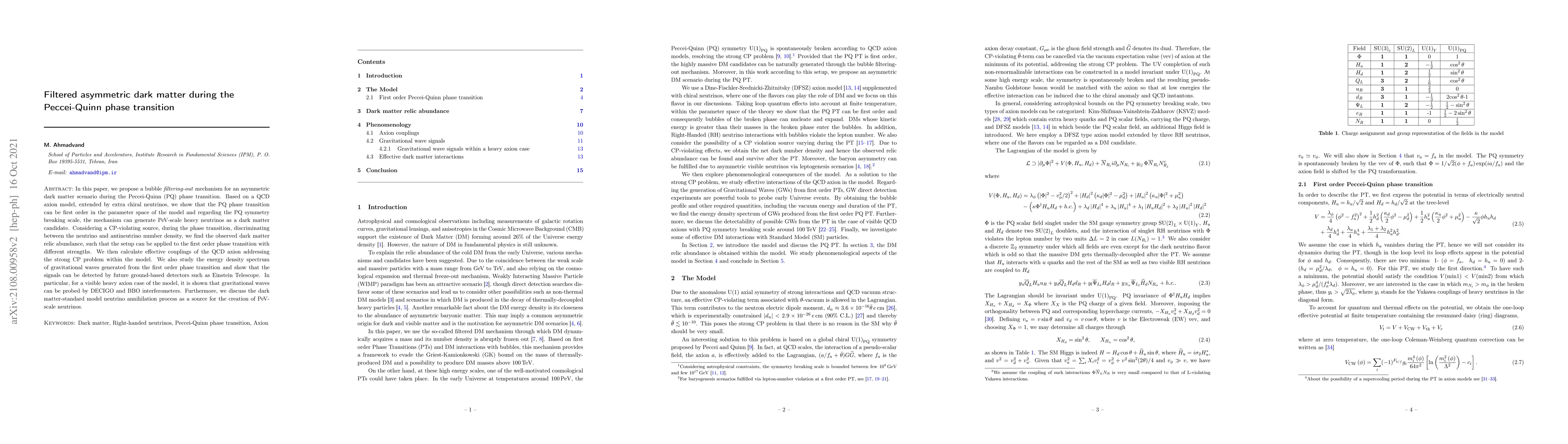 This paper proposes a bubble filtering mechanism for asymmetric dark matter during the Peccei-Quinn phase transition, generating PeV-scale heavy neutrinos as a dark matter candidate. It also explores gravitational wave signals from the phase transition detectable by future detectors and discusses the annihilation process for PeV-scale neutrino creation.
