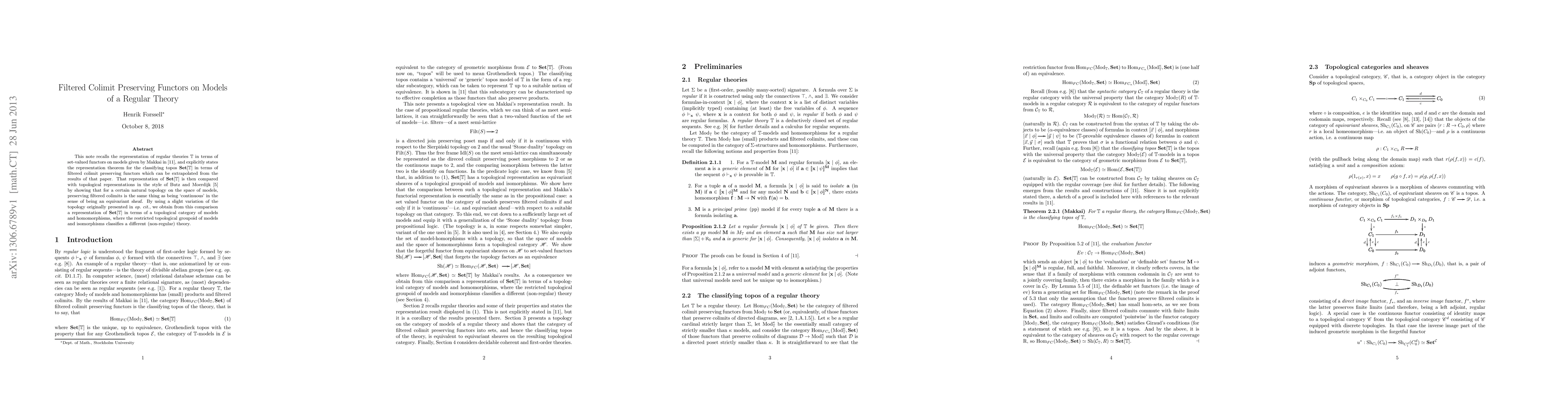 This note recalls the representation of regular theories T in terms of set-valued functors on models given by Makkai(1990), and explicitly states the representation theorem for the classifying topos Set[T] in terms of filtered colimit preserving functors which can be extrapolated from the results of that paper. That representation of Set[T] is then compared with topological representations in the style of Butz and Moerdijk(1998) by showing that for a certain natural topology on the space of models, preserving filtered colimits is the same thing as being `continuous' in the sense of being an equivariant sheaf. By using a slight variation of the topology originally presented in op. cit., we obtain from this comparison a representation of Set[T] in terms of a topological category of models and homomorphisms, where the restricted topological groupoid of models and isomorphisms classifies a different (non-regular) theory.