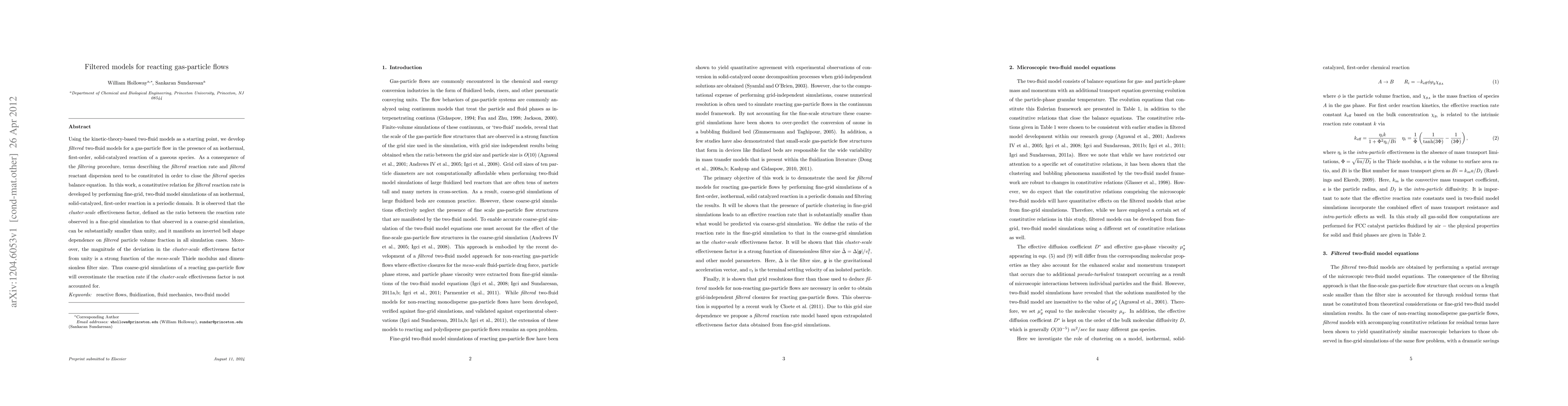 Using the kinetic-theory-based two-fluid models as a starting point, we develop filtered two-fluid models for a gas-particle flow in the presence of an isothermal, first-order, solid-catalyzed reaction of a gaseous species. As a consequence of the filtering procedure, terms describing the filtered reaction rate and filtered reactant dispersion need to be constituted in order to close the filtered species balance equation. In this work, a constitutive relation for filtered reaction rate is developed by performing fine-grid, two-fluid model simulations of an isothermal, solid-catalyzed, first-order reaction in a periodic domain. It is observed that the cluster-scale effectiveness factor, defined as the ratio between the reaction rate observed in a fine-grid simulation to that observed in a coarse-grid simulation, can be substantially smaller than unity, and it manifests an inverted bell shape dependence on filtered particle volume fraction in all simulation cases. Moreover, the magnitude of the deviation in the cluster-scale effectiveness factor from unity is a strong function of the meso-scale Thiele modulus and dimensionless filter size. Thus coarse-grid simulations of a reacting gas-particle flow will overestimate the reaction rate if the cluster-scale effectiveness factor is not accounted for.