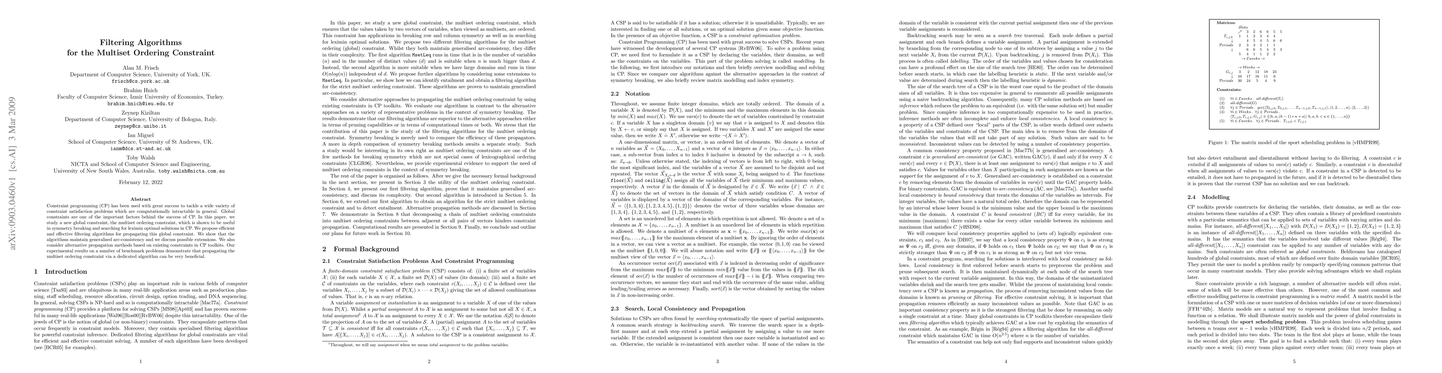 This paper introduces a new global constraint, the multiset ordering constraint, and proposes efficient filtering algorithms for it, demonstrating its utility in symmetry breaking and leximin optimal solutions in constraint programming. Experimental results show that dedicated algorithms for this constraint outperform alternative propagation methods.