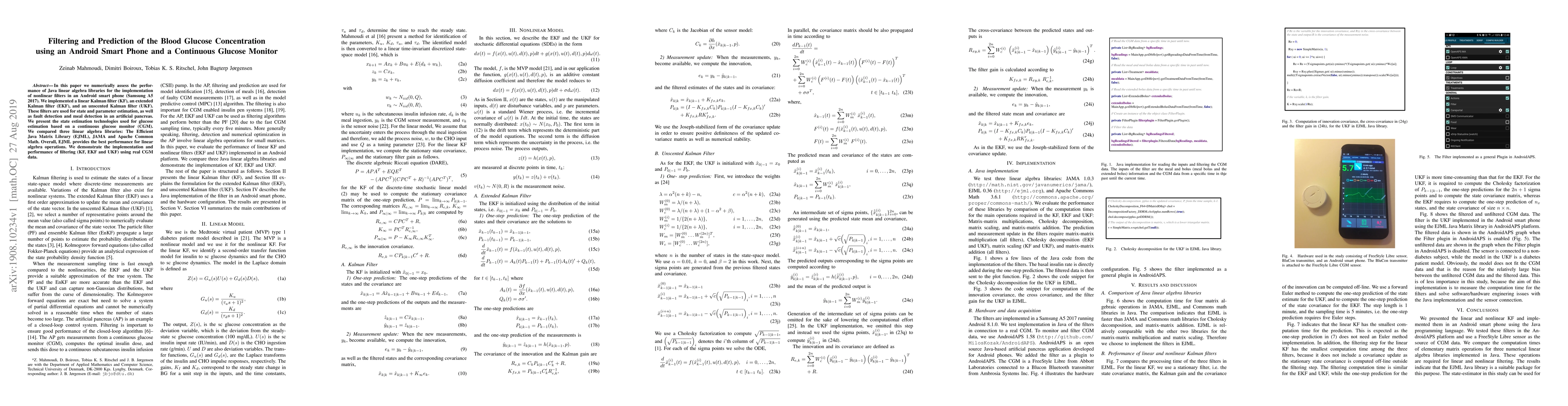 In this paper we numerically assess the performance of Java linear algebra libraries for the implementation of nonlinear filters in an Android smart phone (Samsung A5 2017). We implemented a linear Kalman filter (KF), an extended Kalman filter (EKF), and an unscented Kalman filter (UKF). These filters are used for state and parameter estimation, as well as fault detection and meal detection in an artificial pancreas. We present the state estimation technologies used for glucose estimation based on a continuous glucose monitor (CGM). We compared three linear algebra libraries: The Efficient Java Matrix Library (EJML), JAMA and Apache Common Math. Overall, EJML provides the best performance for linear algebra operations. We demonstrate the implementation and performance of filtering (KF, EKF and UKF) using real CGM data.