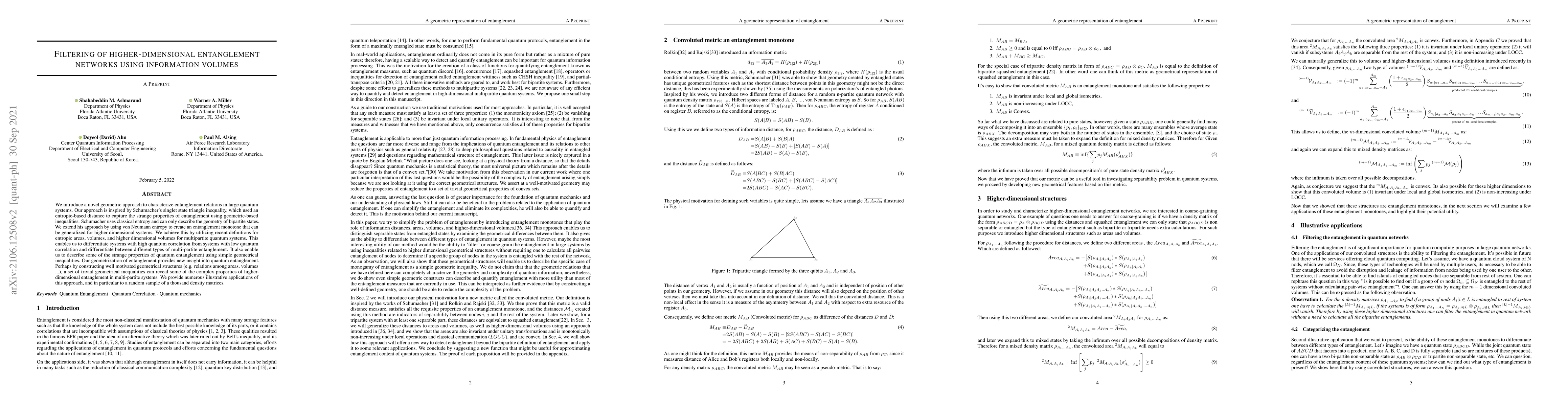 This paper introduces a geometric method to characterize entanglement in large quantum systems using information volumes, extending Schumacher's entropic-based approach to higher-dimensional systems. The method differentiates between high and low quantum correlation and various types of multi-partite entanglement, offering new insights into quantum entanglement.