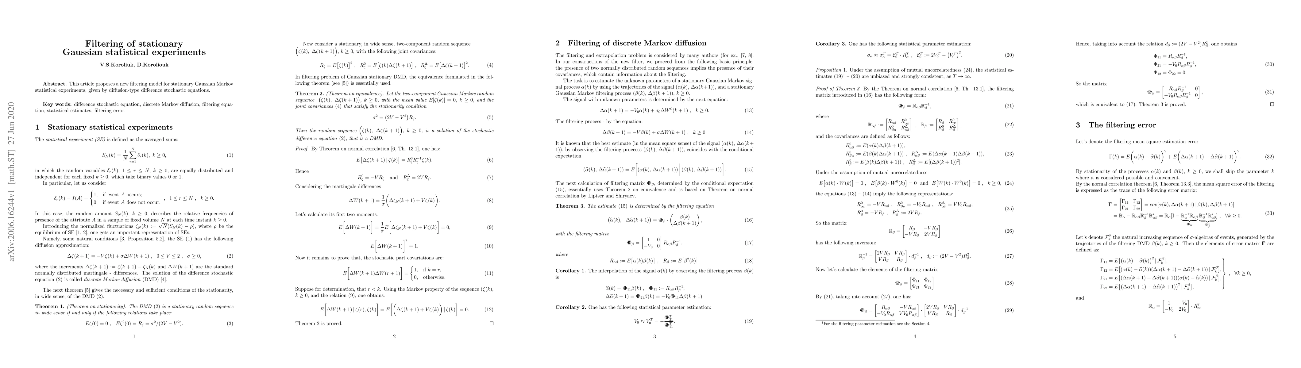 This article proposes a new filtering model for stationary Gaussian Markov statistical experiments, given by diffusion-type difference stochastic equations.