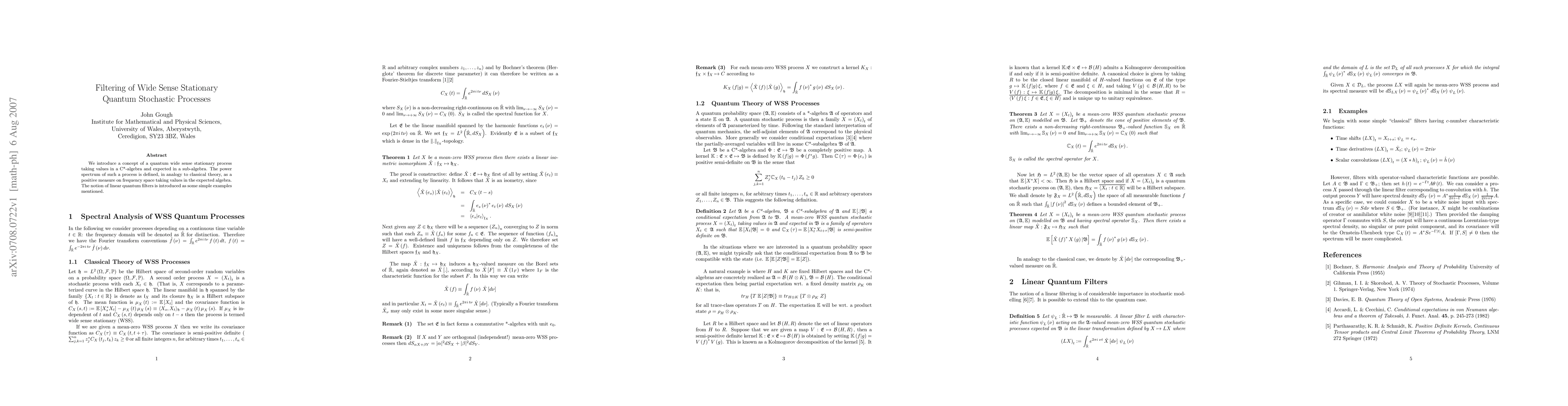 Researchers introduced a concept for quantum wide sense stationary processes with a defined power spectrum, allowing for linear filters to analyze these processes. This work builds upon classical theory's framework for analyzing random signals.
