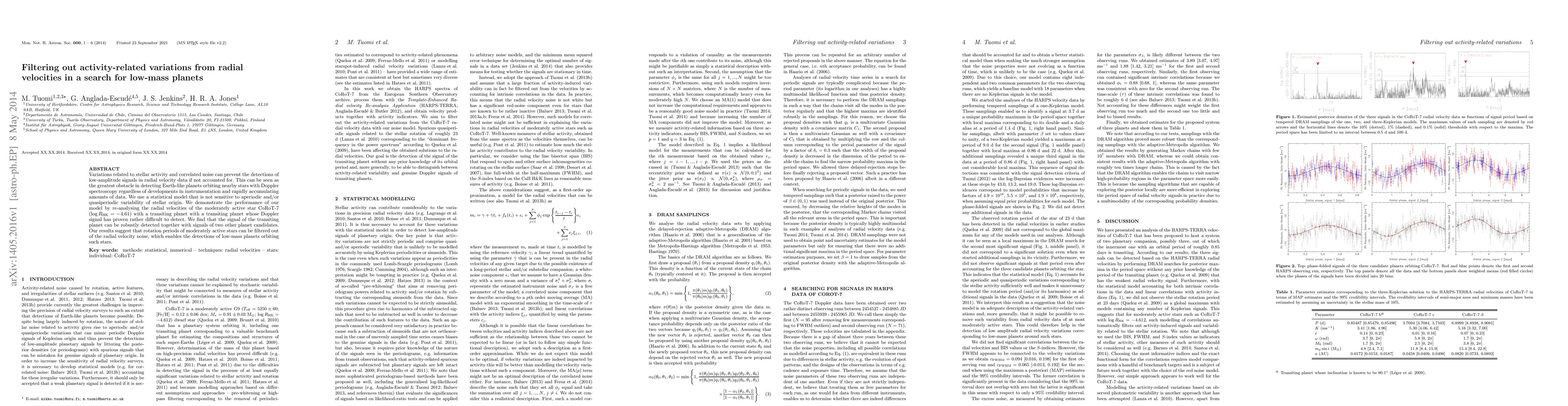This paper presents a statistical model to filter out stellar activity-related variations from radial velocity data, enabling the detection of low-mass planets. The model is demonstrated on CoRoT-7, successfully revealing signals of a transiting planet and two other planet candidates, suggesting it can effectively isolate rotation-induced noise in moderately active stars.