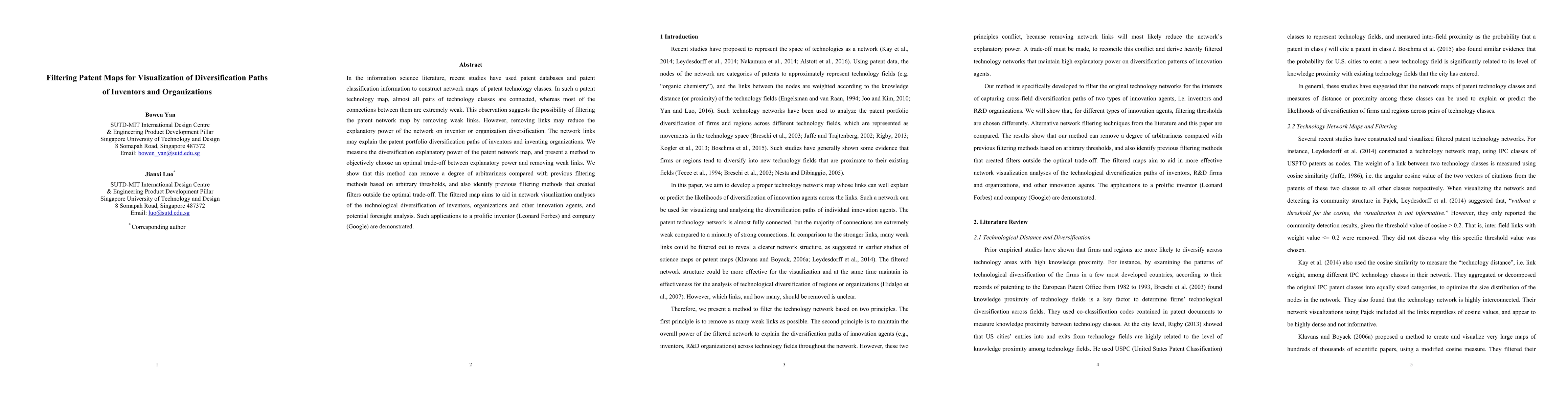 This paper proposes a method to filter patent network maps by removing weak links while maintaining the explanatory power for inventor and organization diversification. It introduces an optimal trade-off approach to visualization, demonstrating its effectiveness through case studies on inventor Leonard Forbes and company Google.