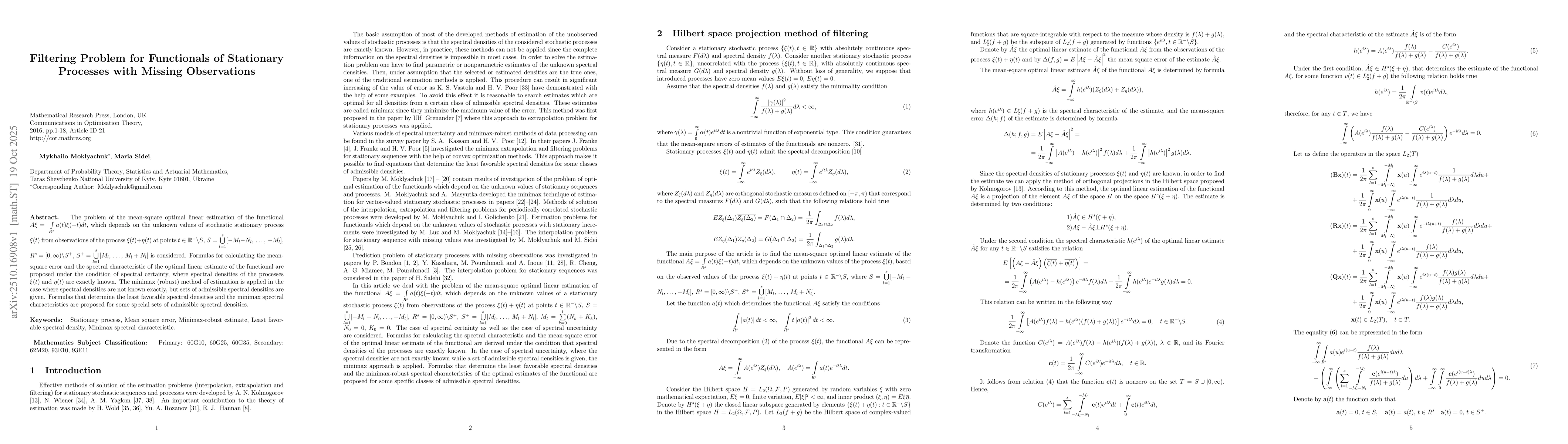 The research employs spectral analysis and minimax robust estimation techniques to address the filtering problem for functionals of stationary processes with missing observations. It derives formulas for mean-square error and spectral characteristics under spectral certainty and applies minimax methods when spectral densities are uncertain.