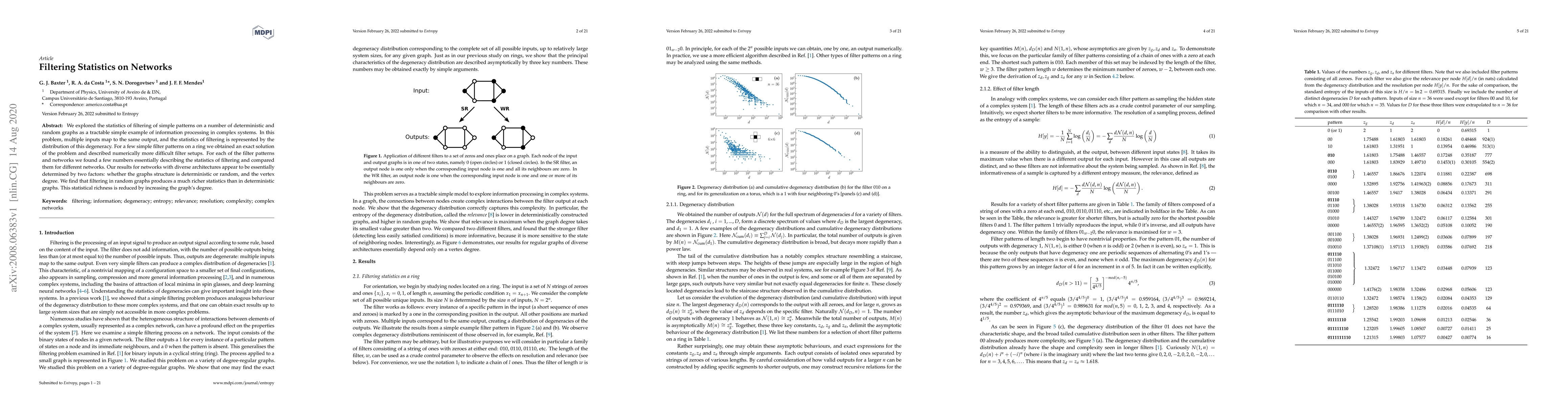 We explored the statistics of filtering of simple patterns on a number of deterministic and random graphs as a tractable simple example of information processing in complex systems. In this problem, multiple inputs map to the same output, and the statistics of filtering is represented by the distribution of this degeneracy. For a few simple filter patterns on a ring we obtained an exact solution of the problem and described numerically more difficult filter setups. For each of the filter patterns and networks we found a few numbers essentially describing the statistics of filtering and compared them for different networks. Our results for networks with diverse architectures appear to be essentially determined by two factors: whether the graphs structure is deterministic or random, and the vertex degree. We find that filtering in random graphs produces a much richer statistics than in deterministic graphs. This statistical richness is reduced by increasing the graph's degree.