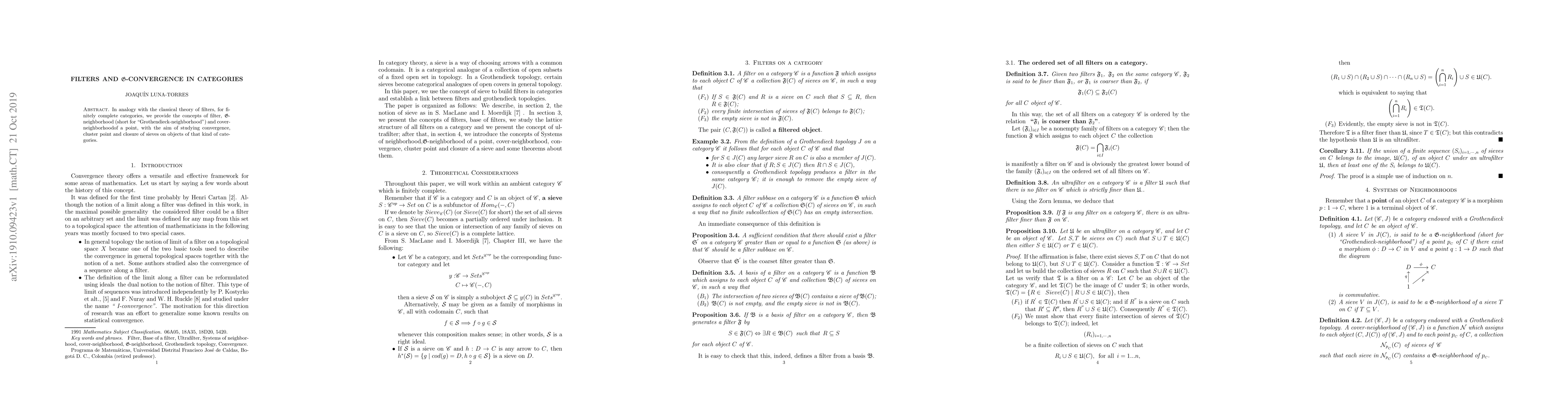 In analogy with the classical theory of filters, for finitely complete categories, we provide the concepts of filter, G-neighborhood (short for \Grothendieck-neighborhood") and cover-neighborhood of a point, with the aim of studying convergence, cluster point and closure of sieves on objects of that kind of categories.