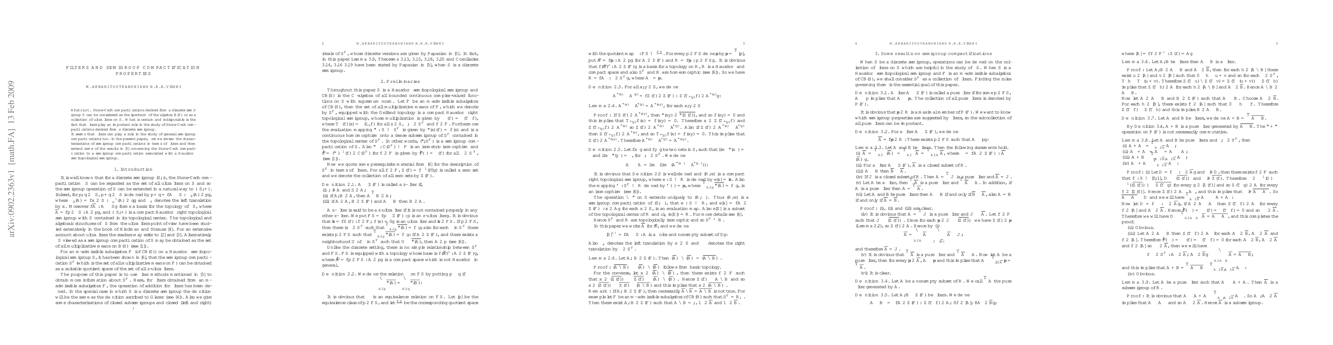 Stone-$\breve{C}$ech compactifications derived from a discrete semigroup $S$ can be considered as the spectrum of the algebra $\mathcal{B}(S)$ or as a collection of ultrafilters on $S$. What is certain and indisputable is the fact that filters play an important role in the study of Stone-$\breve{C}$ech compactifications derived from a discrete semigroup. It seems that filters can play a role in the study of general semigroup compactifications too. In the present paper, first we review the characterizations of semigroup compactifications in terms of filters and then extend some of the results in \cite{Talin1} concerning the Stone-$\breve{C}$ech compactification to a semigroup compactification associated with a Hausdorff semitopological semigroup.
