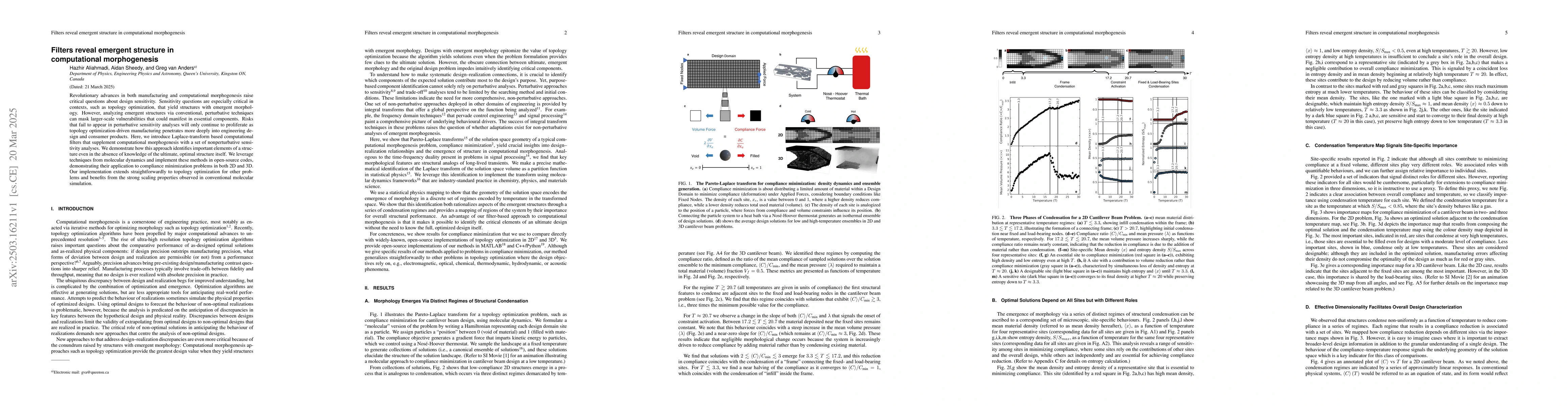 The research introduces Laplace-transform based computational filters that supplement computational morphogenesis with nonperturbative sensitivity analyses. These filters are demonstrated using open-source codes for compliance minimization problems in both 2D and 3D.