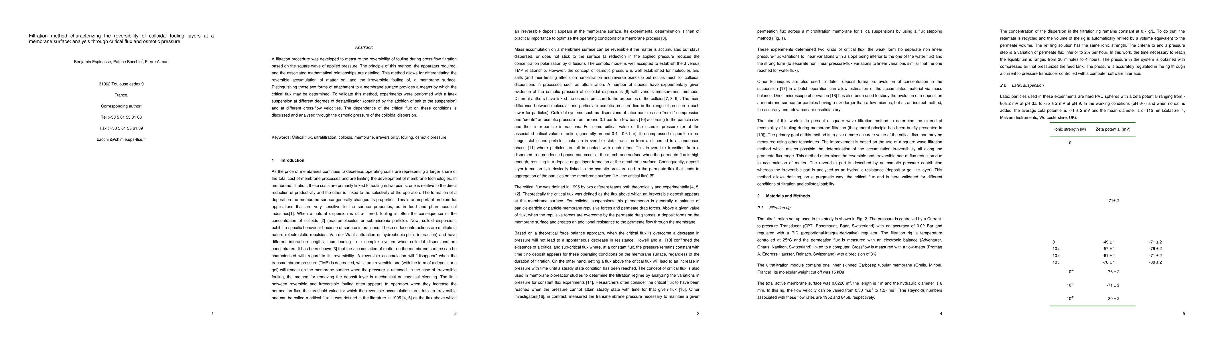 This paper develops a filtration method to assess the reversibility of colloidal fouling on membrane surfaces using a square wave pressure approach. The method distinguishes reversible and irreversible fouling, enabling the determination of critical flux, validated through experiments with latex suspensions under varying destabilization and flow conditions, analyzed via osmotic pressure.