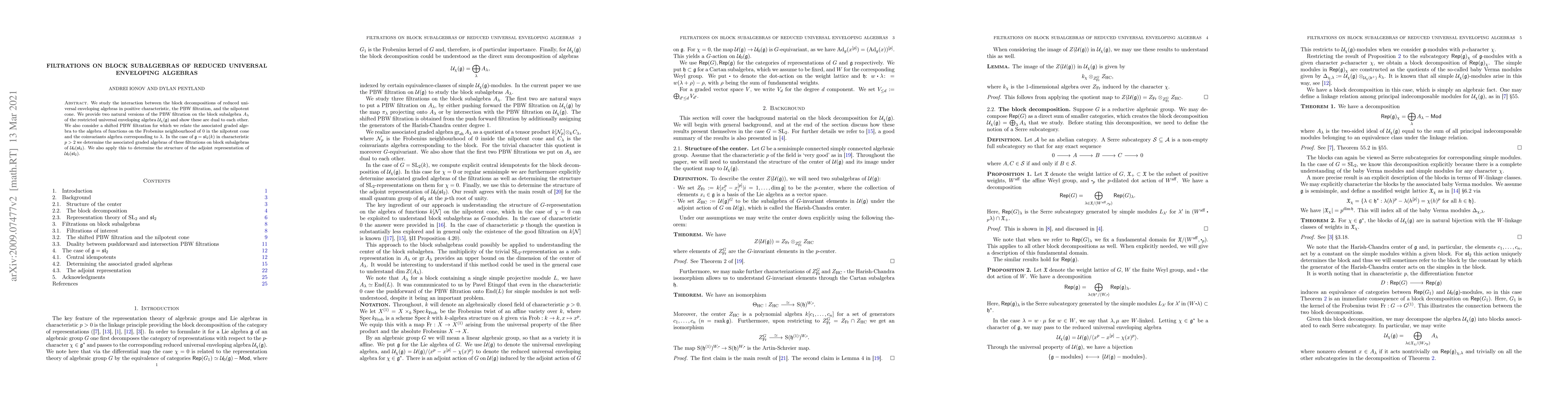 We study the interaction between the block decompositions of reduced universal enveloping algebras in positive characteristic, the PBW filtration, and the nilpotent cone. We provide two natural versions of the PBW filtration on the block subalgebra $A_\lambda$ of the restricted universal enveloping algebra $\mathcal{U}_\chi(\mathfrak{g})$ and show these are dual to each other. We also consider a shifted PBW filtration for which we relate the associated graded algebra to the algebra of functions on the Frobenius neighbourhood of $0$ in the nilpotent cone and the coinvariants algebra corresponding to $\lambda$. In the case of $\mathfrak{g}=\mathfrak{sl}_2(k)$ in characteristic $p>2$ we determine the associated graded algebras of these filtrations on block subalgebras of $\mathcal{U}_0(\mathfrak{sl}_2)$. We also apply this to determine the structure of the adjoint representation of $\mathcal{U}_0(\mathfrak{sl}_2)$.