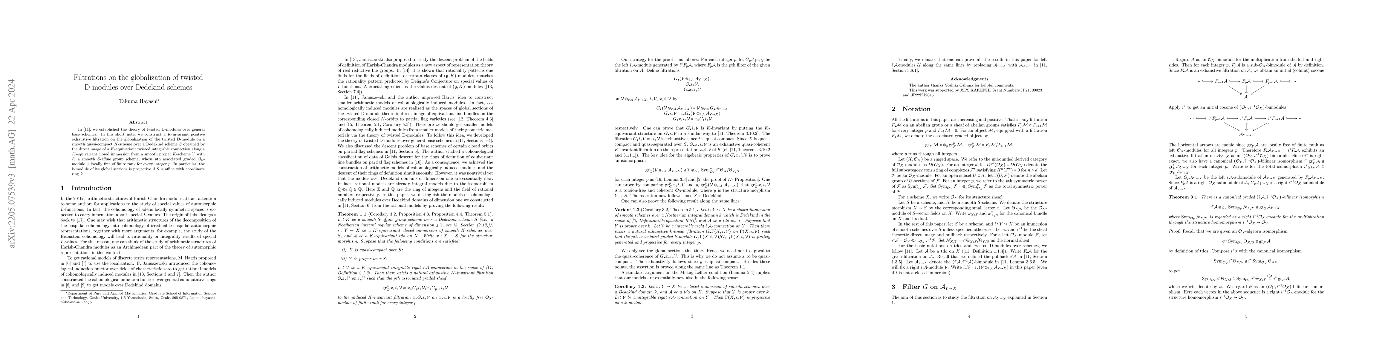 This paper constructs a $K$-invariant filtration on the globalization of twisted D-modules over Dedekind schemes, demonstrating that the associated graded module is locally free and the global sections module is projective when $S$ is affine.