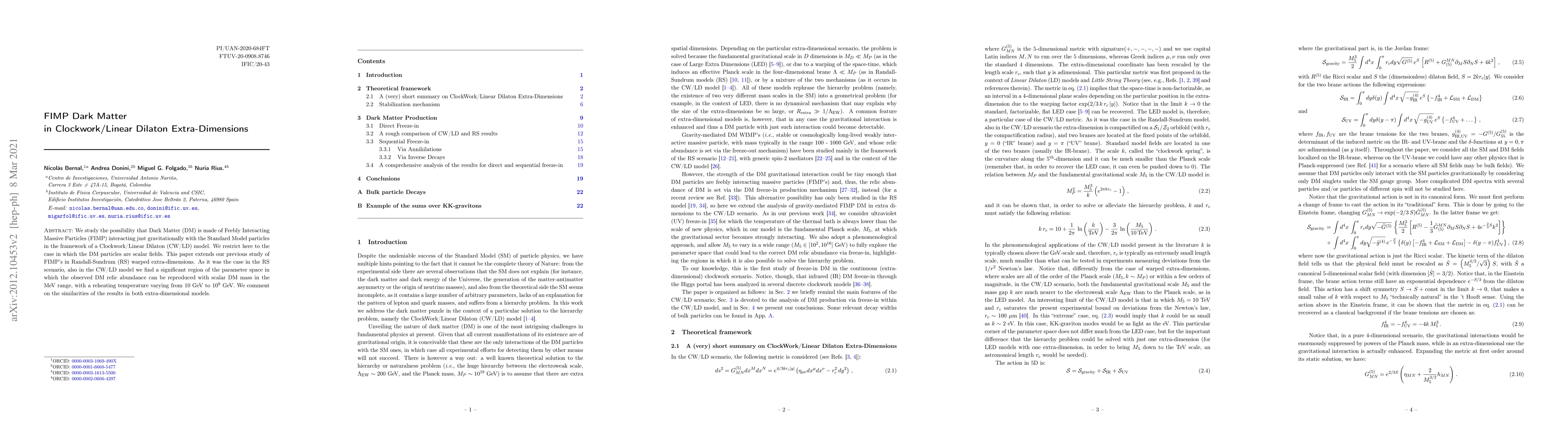 We study the possibility that Dark Matter (DM) is made of Feebly Interacting Massive Particles (FIMP) interacting just gravitationally with the Standard Model particles in the framework of a Clockwork/Linear Dilaton (CW/LD) model. We restrict here to the case in which the DM particles are scalar fields. This paper extends our previous study of FIMP's in Randall-Sundrum (RS) warped extra-dimensions. As it was the case in the RS scenario, also in the CW/LD model we find a significant region of the parameter space in which the observed DM relic abundance can be reproduced with scalar DM mass in the MeV range, with a reheating temperature varying from 10 GeV to $10^{9}$ GeV. We comment on the similarities of the results in both extra-dimensional models.