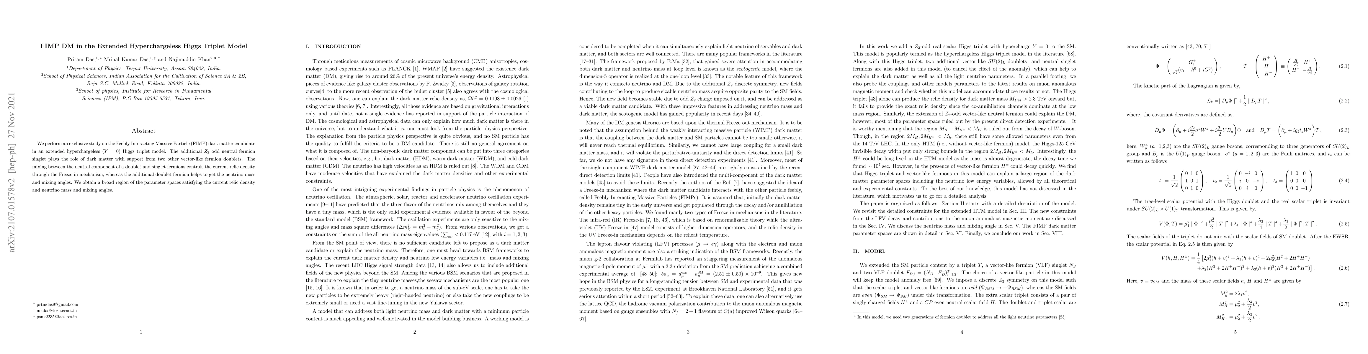 We perform an exclusive study on the Feebly Interacting Massive Particle (FIMP) dark matter candidate in an extended hyperchargeless ($Y=0$) Higgs triplet model. The additional $Z_2$ odd neutral fermion singlet plays the role of dark matter with support from two other vector-like fermion doublets. The mixing between the neutral component of a doublet and singlet fermions controls the current relic density through the Freeze-in mechanism, whereas the additional doublet fermion helps to get the neutrino mass and mixing angles. We obtain a broad region of the parameter spaces satisfying the current relic density and neutrino mass and mixing angles.