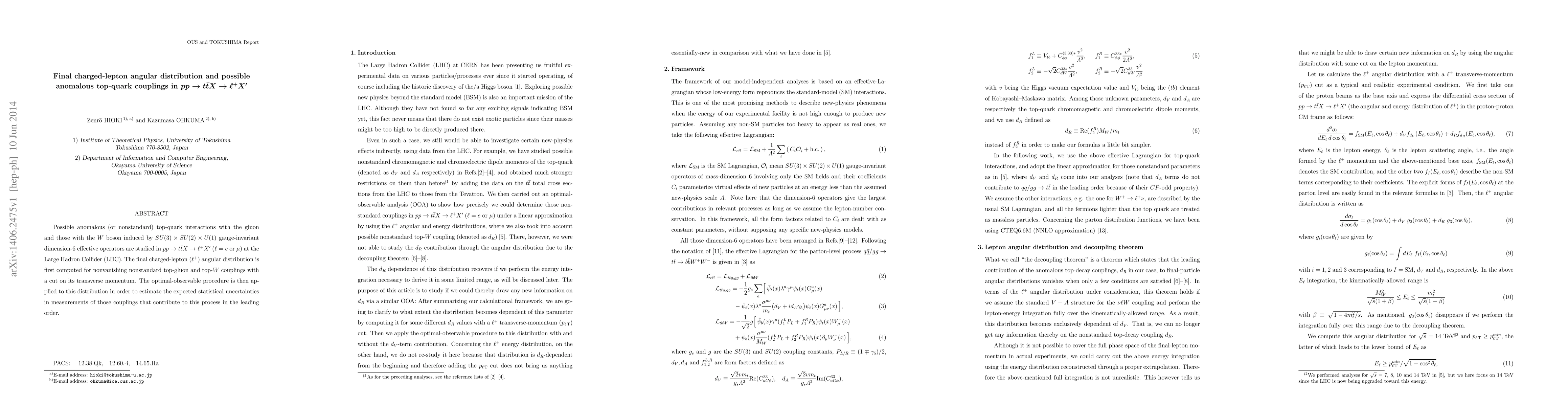 Possible anomalous (or nonstandard) top-quark interactions with the gluon and those with the W boson induced by SU(3) x SU(2) x U(1) gauge-invariant dimension-6 effective operators are studied in p p -> t tbar X -> l^+ X' (l=e or mu) at the Large Hadron Collider (LHC). The final charged-lepton (l^+) angular distribution is first computed for nonvanishing nonstandard top-gluon and top-W couplings with a cut on its transverse momentum. The optimal-observable procedure is then applied to this distribution in order to estimate the expected statistical uncertainties in measurements of those couplings that contribute to this process in the leading order.