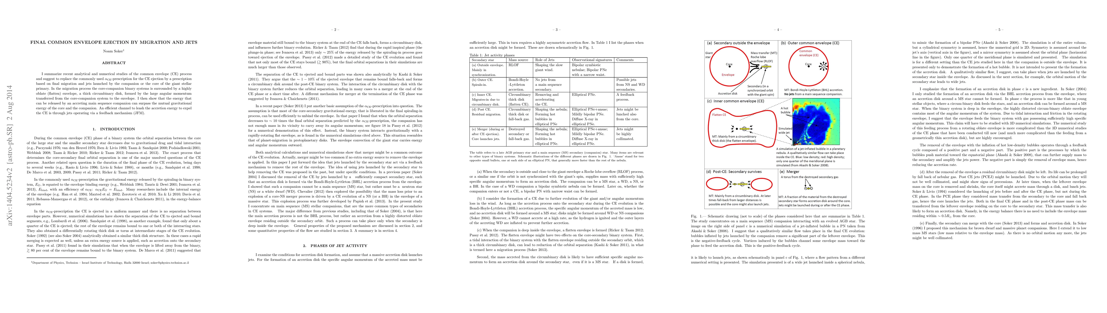 This paper proposes replacing the traditional alpha-prescription for common envelope ejection with a model based on final migration and jets driven by the companion or the core of the giant star. It highlights the role of a thick circumbinary disk and the potential for jets to efficiently expel the common envelope via a feedback mechanism.