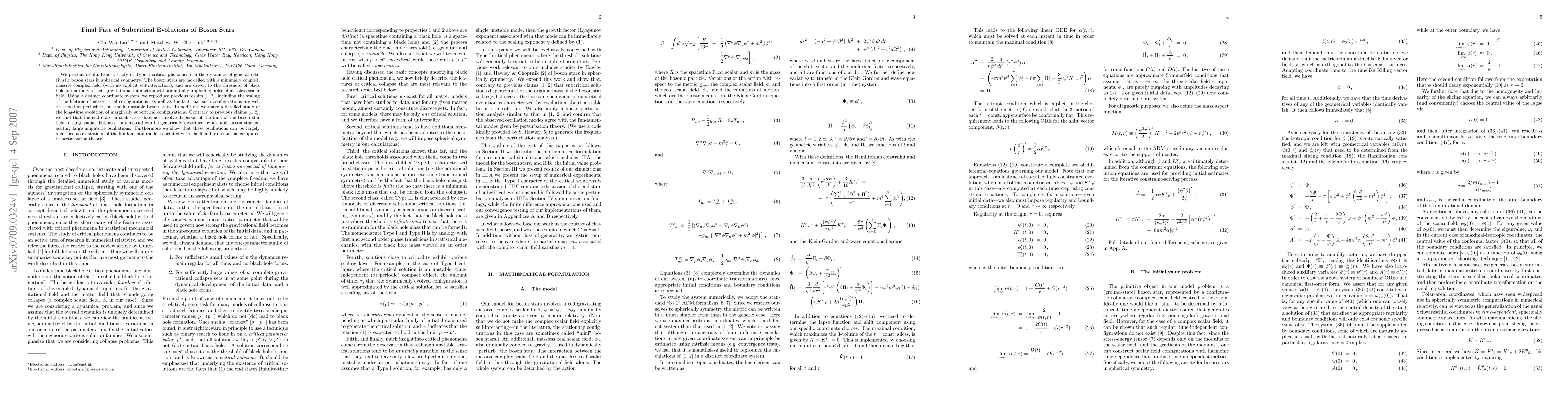 We present results from a study of Type I critical phenomena in the dynamics of general relativistic boson stars in spherical symmetry. The boson stars are modelled with a minimally coupled, massive complex field (with no explicit self-interaction), and are driven to the threshold of black hole formation via their gravitational interaction with an initially imploding pulse of massless scalar field. Using a distinct coordinate system, we reproduce previous results [1,2], including the scaling of the lifetime of near-critical configurations, as well as the fact that such configurations are well described as perturbed, one-mode-unstable boson stars. In addition, we make a detailed study of the long-time evolution of marginally subcritical configurations. Contrary to previous claims [1,2], we find that the end state in such cases does not involve dispersal of the bulk of the boson star field to large radial distances, but instead can be generically described by a stable boson star executing large amplitude oscillations. Furthermore we show that these oscillations can be largely identified as excitations of the fundamental mode associated with the final boson star, as computed in perturbation theory.