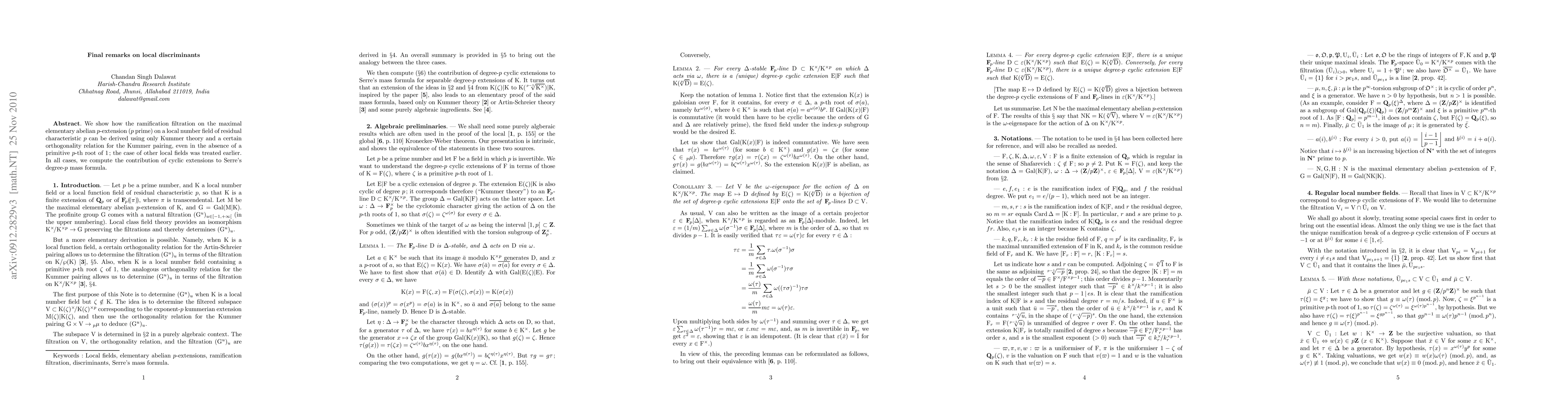 We show how the ramification filtration on the maximal elementary abelian p-extension (p prime) on a local number field of residual characteristic p can be derived using only Kummer theory and a certain orthogonality relation for the Kummer pairing, even in the absence of a primitive p-th root of 1; the case of other local fields with finite residue fields was treated earlier. In all cases, we compute the contribution of cyclic extensions to Serre's degree-$p$ mass formula.