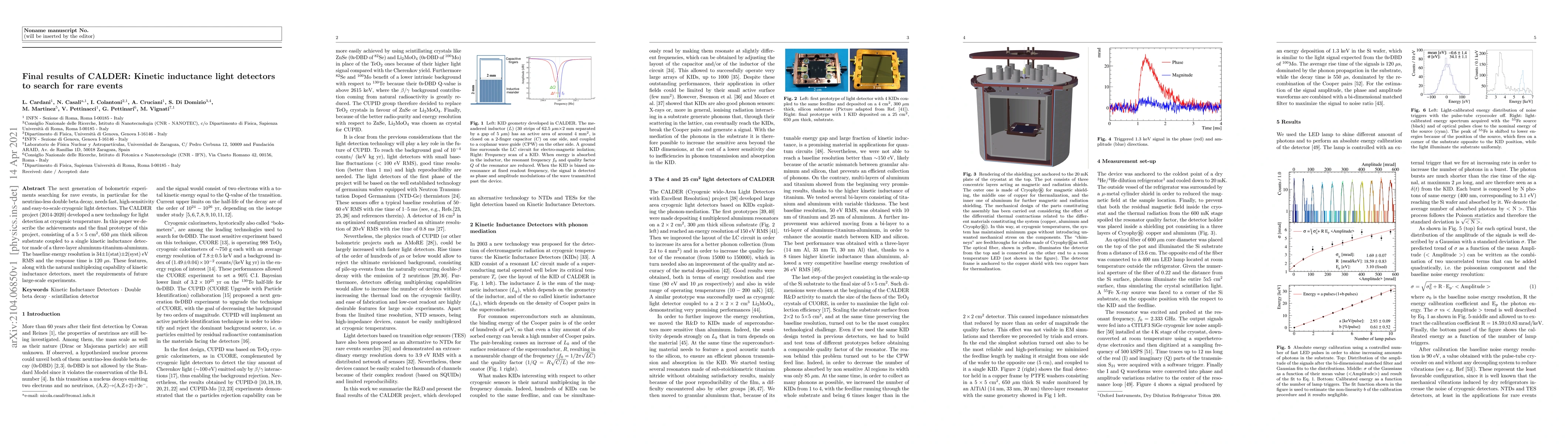 The CALDER project developed a new technology for cryogenic light detection with high sensitivity and fast response time, achieving a baseline energy resolution of 34 eV RMS.