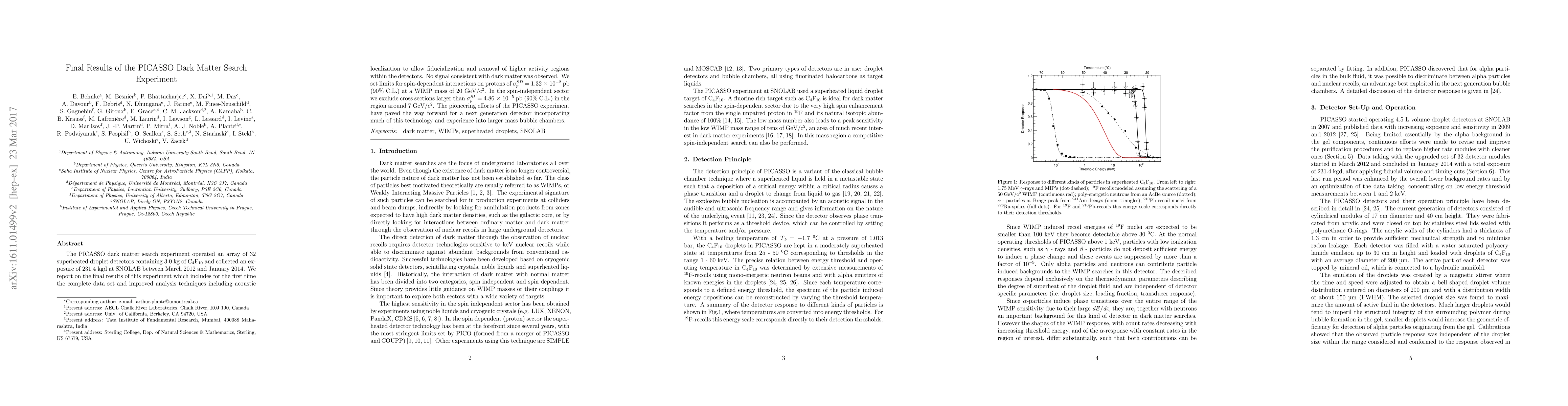 The PICASSO experiment utilized 32 superheated droplet detectors to search for dark matter, analyzing 231.4 kgd of exposure. No dark matter signals were detected, setting stringent limits on both spin-dependent and spin-independent interactions.