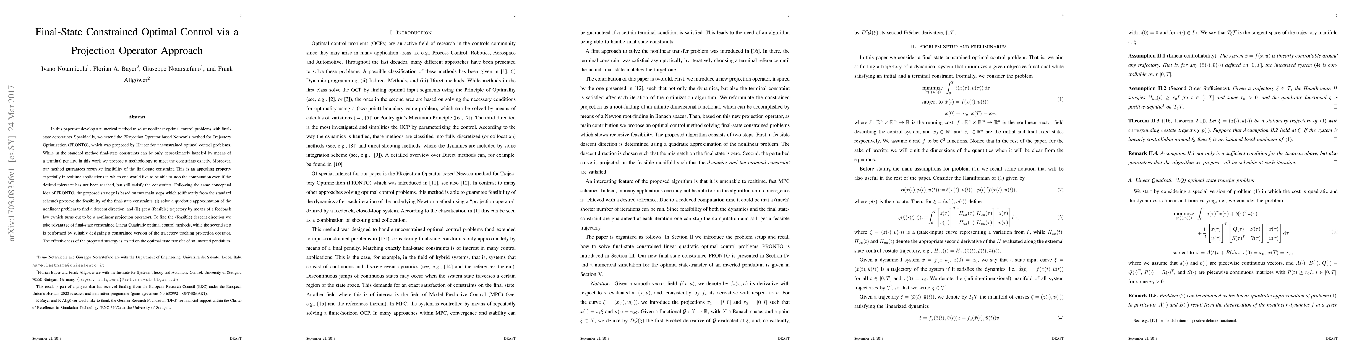 This paper introduces a numerical method to solve nonlinear optimal control problems with exact final-state constraints, extending PRONTO. It guarantees recursive feasibility and employs a projection operator to ensure constraint satisfaction, tested on an inverted pendulum state transfer.