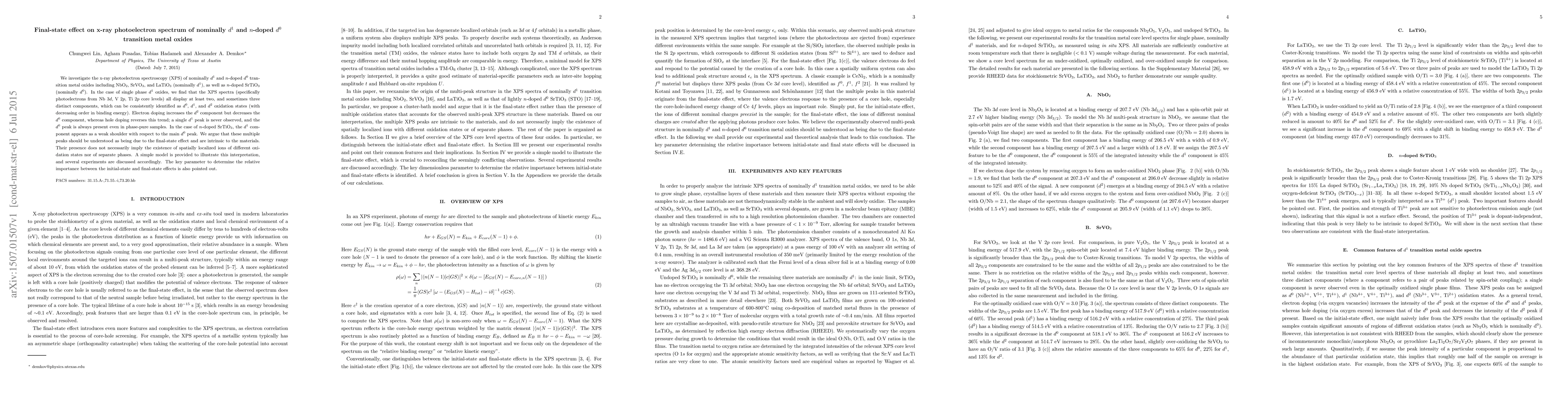 This paper investigates the x-ray photoelectron spectroscopy (XPS) of transition metal oxides, finding multiple distinct peaks in $d^1$ oxides, which are attributed to final-state effects rather than separate phases or localized ions. Electron doping enhances the $d^2$ component while reducing $d^0$, while hole doping does the opposite.