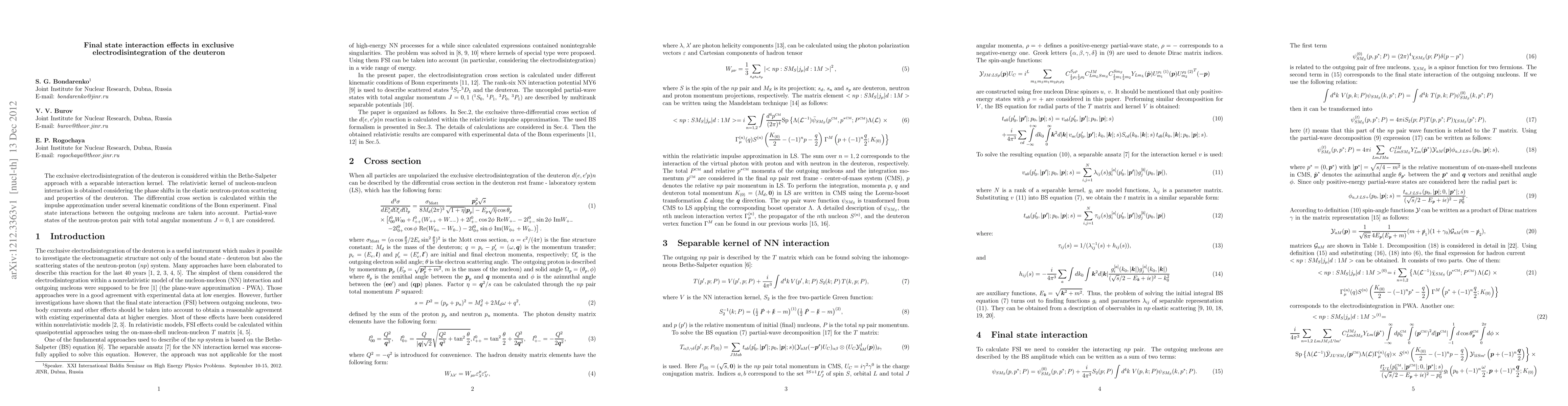 The exclusive electrodisintegration of the deuteron is considered within the Bethe-Salpeter approach with a separable interaction kernel. The relativistic kernel of nucleon-nucleon interaction is obtained considering the phase shifts in the elastic neutron-proton scattering and properties of the deuteron. The differential cross section is calculated within the impulse approximation under several kinematic conditions of the Bonn experiment. Final state interactions between the outgoing nucleons are taken into account. Partial-wave states of the neutron-proton pair with total angular momentum J=0,1 are considered.
