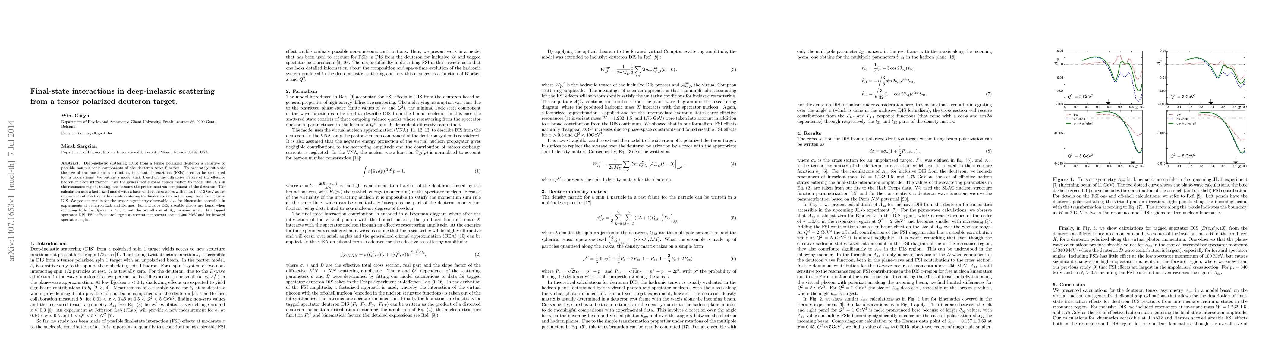 Deep-inelastic scattering (DIS) from a tensor polarized deuteron is sensitive to possible non-nucleonic components of the deuteron wave function. To accurately estimate the size of the nucleonic contribution, final-state interactions (FSIs) need to be accounted for in calculations. We outline a model that, based on the diffractive nature of the effective hadron-nucleon interaction, uses the generalized eikonal approximation to model the FSIs in the resonance region, taking into account the proton-neutron component of the deuteron. The calculation uses a factorized model with a basis of three resonances with mass $W<2$ GeV as the relevant set of effective hadron states entering the final-state interaction amplitude for inclusive DIS. We present results for the tensor asymmetry observable $A_{zz}$ for kinematics accessible in experiments at Jefferson Lab and Hermes. For inclusive DIS, sizeable effects are found when including FSIs for Bjorken $x>0.2$, but the overall size of $A_{zz}$ remains small. For tagged spectator DIS, FSIs effects are largest at spectator momenta around 300 MeV and for forward spectator angles.