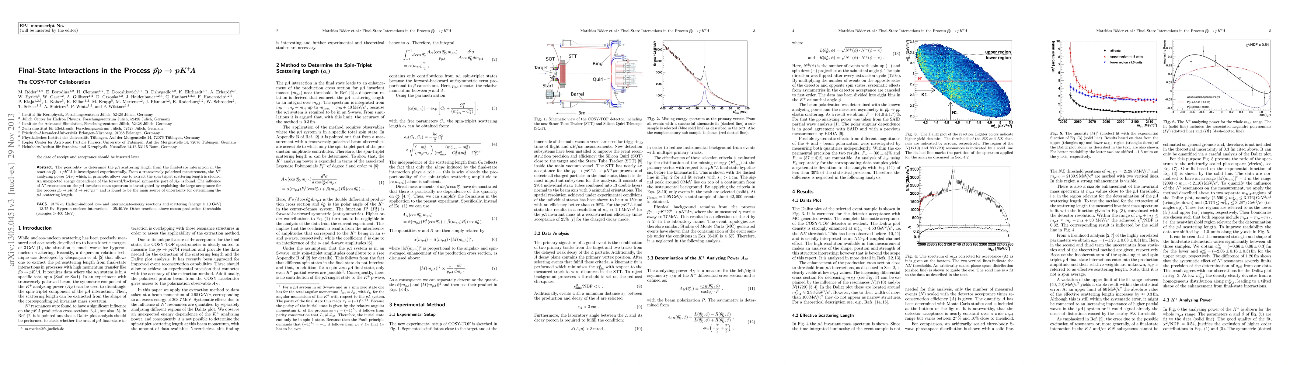 The possibility to determine the pLambda scattering length from the final-state interaction in the reaction pp->pKLambda is investigated experimentally. From a transversely polarized measurement, the K analyzing power (A_N) which, in principle, allows one to extract the spin triplet scattering length is studied. An unexpected energy dependence of the forward/backward symmetric part of A_N is found. The influence of N*-resonances on the pLambda invariant mass spectrum is investigated by exploiting the large acceptance for the process pp->pKLambda->pKppi and is found to be the main source of uncertainty for determining the pLambda scattering length.