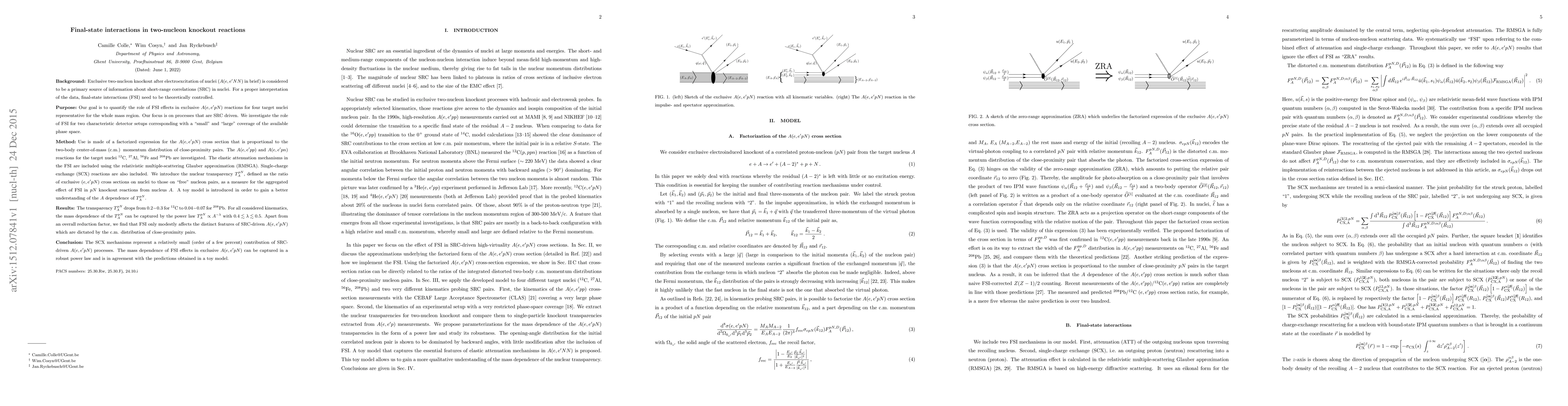This paper investigates the role of final-state interactions (FSI) in exclusive two-nucleon knockout reactions, finding that FSI modestly affects the distinct features of short-range correlation-driven processes. The transparency ratio for these reactions shows a mass dependence captured by the power law $T^{pN}_{A} \propto A^{- \lambda}$ with $0.4 \lesssim \lambda \lesssim 0.5$.