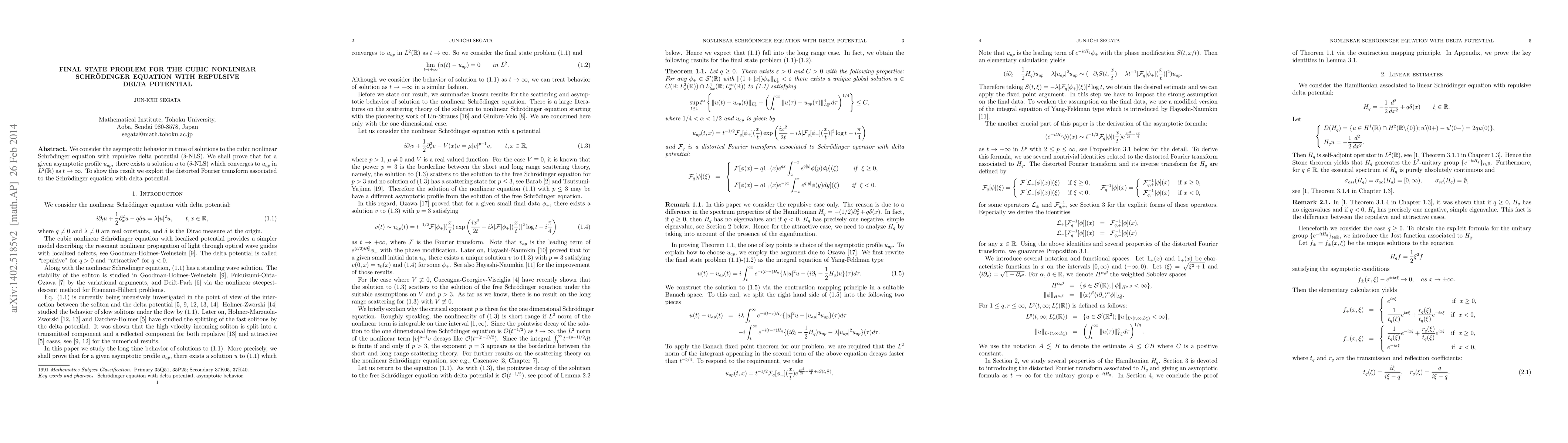 This paper investigates the asymptotic behavior of solutions to the cubic nonlinear Schrödinger equation with repulsive delta potential, proving the existence of a solution that converges to a specified asymptotic profile as time approaches infinity, utilizing the distorted Fourier transform technique.